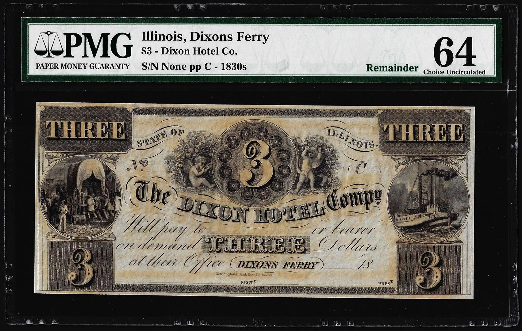 1800's $3 Dixon Hotel Dixons Ferry, IL Obsolete Note PMG Choice Uncirculated 64