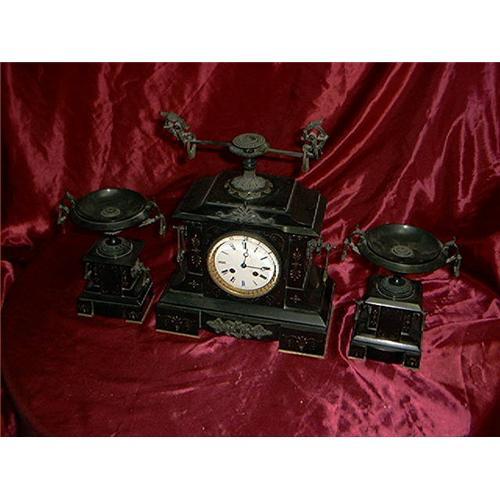 This is a real beautiful clock with side pieces, all marble and bronze and it just came out of clock shop. We have it running great. Now when I got this clock, it was in several pieces, and my clock guy got it running great, it has no back door, So you are buying a great old clock, that runs and looks great, It is very old, and it is marble and bronze, and a great looking clock. I also cannot find any name, or markings on it, and also don't know where to look for them. So we have a beautiful old clock, with no name, and no markings, and is very old, and runs great. I am sure somewhere there has to be a name, but your guess is better than mine. Hope you like it, and it will make a nice add to any you collect, as it is very old. Good luck and if you need any other info, or photos, please e-mail us. Thanks and enjoy. I did not add the size of the clock, as it has the scale that goes on top, if that was all on, it would be at least 18" to 22" H. Hope all this info helps you. I have more photos if you need them. Also one that shows a head in the middle of the scales. Have new photos and will try and add them for you. It looks great all together, and runs great. Very nice add to any collection you may have. They tell me it is one of the better ones we have had in a while. This is a great add to any collection and a great investment, as it works and is over 100 years old, and still looks great.