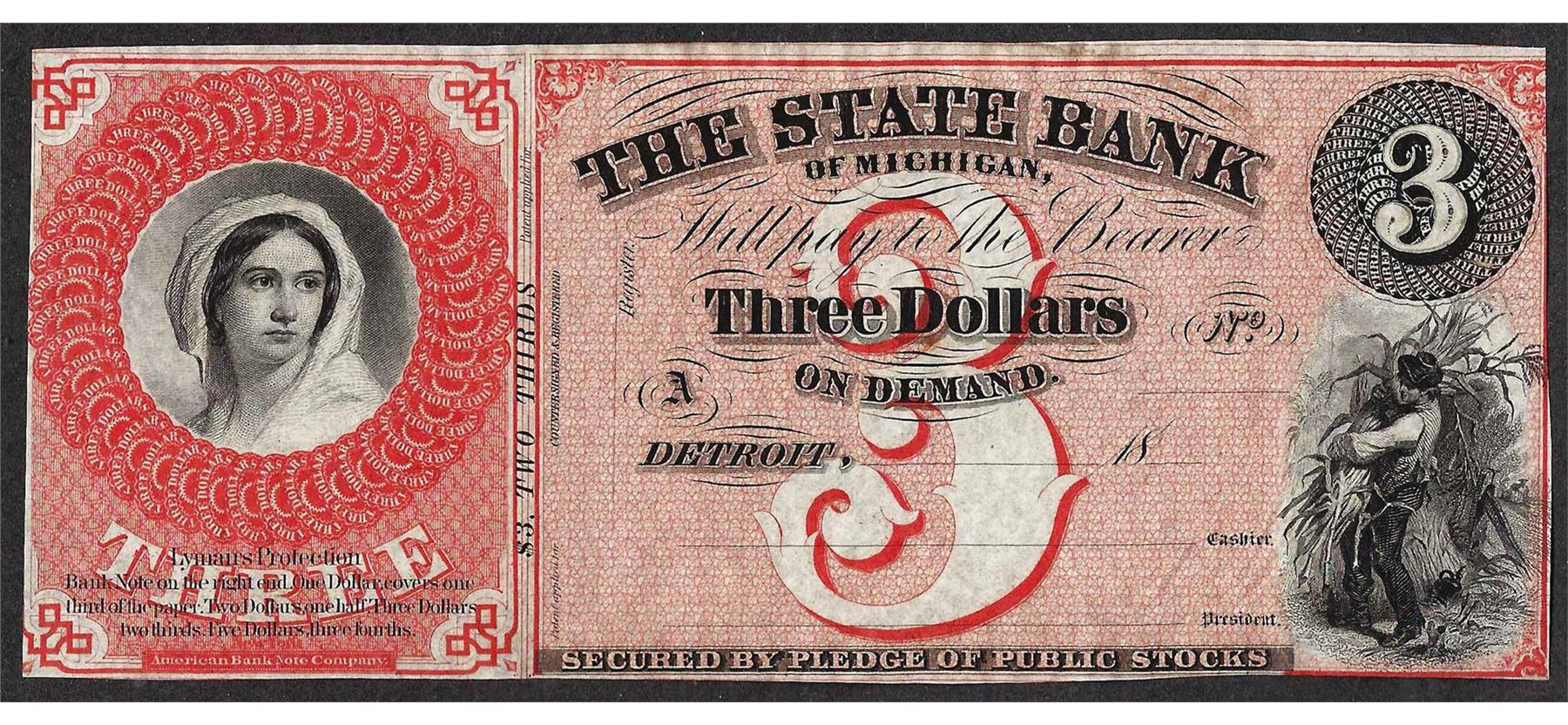 One 1800's $3 The State Bank of Michigan Obsolete Note.