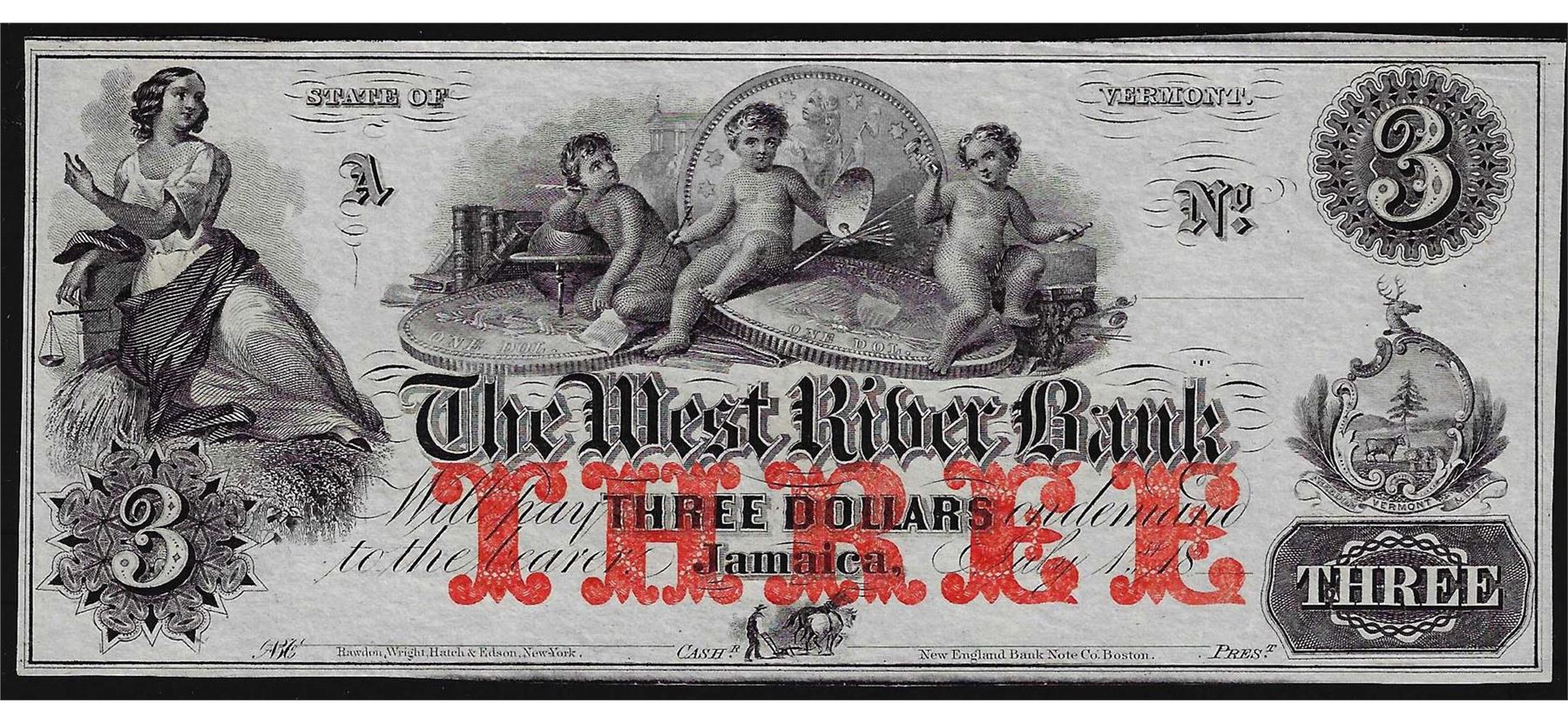 One 1800's $3 The West River Bank Obsolete Bank Note.