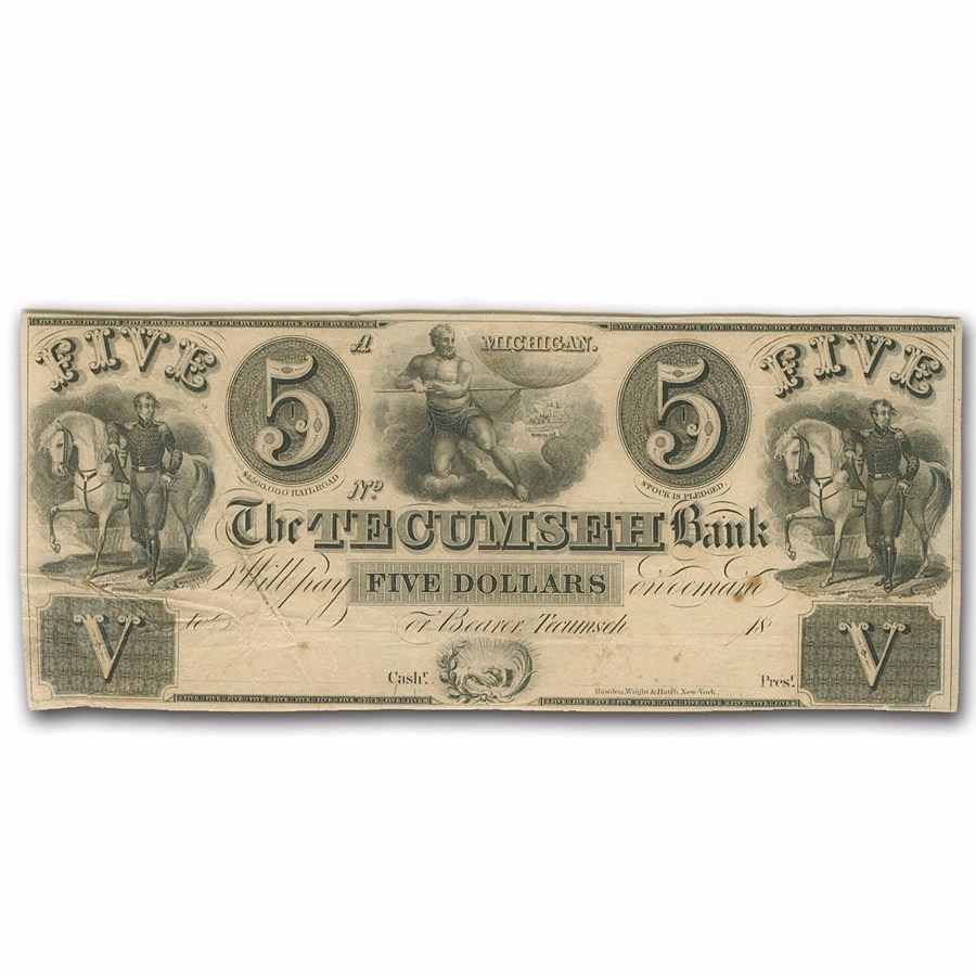 One 1800's $5 Tecumseh Bank Obsolete Bank Note.