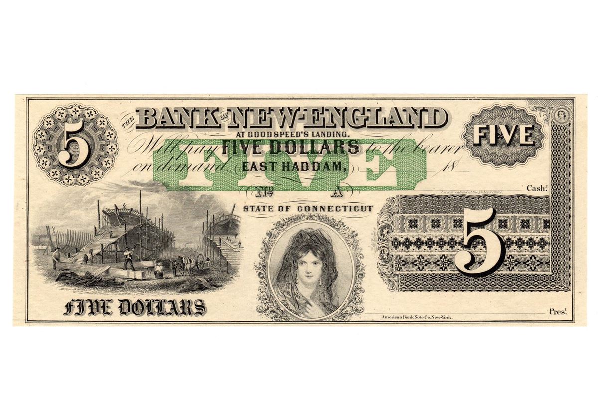 One 1800's $5 The Bank of New England Goodspeed's Note.