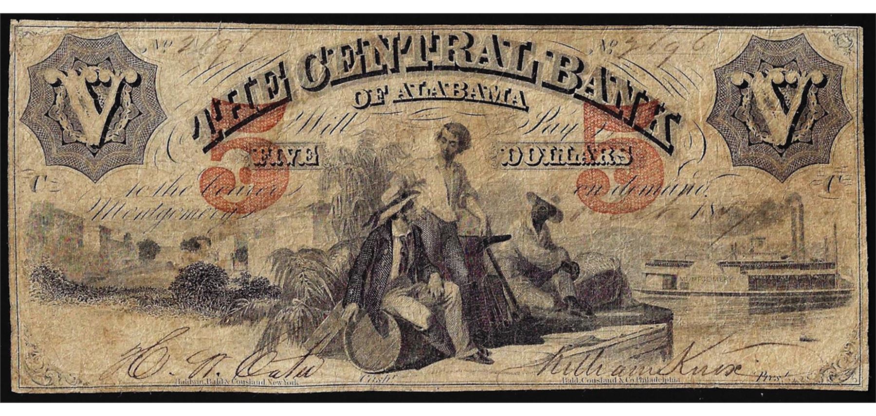One 1800's $5 The Central Bank of Alabama Obsolete Note.