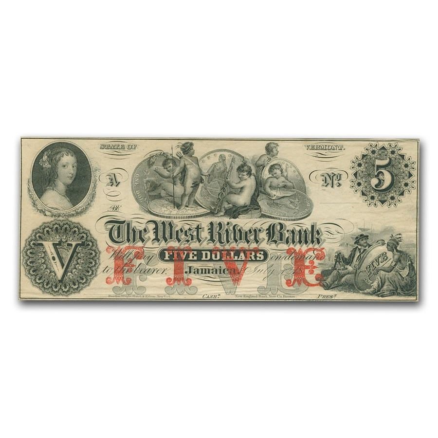 One 1800's $5 The West River Bank Obsolete Bank Note.