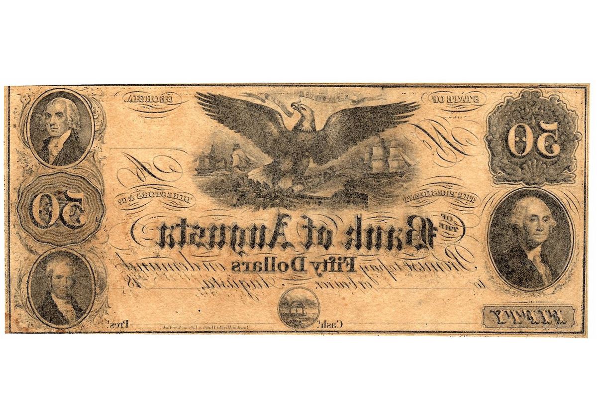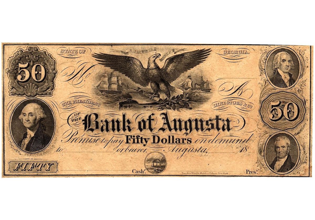 One 1800's $50 State of Georgia Bank of Augusta Obsolete Currency Note.