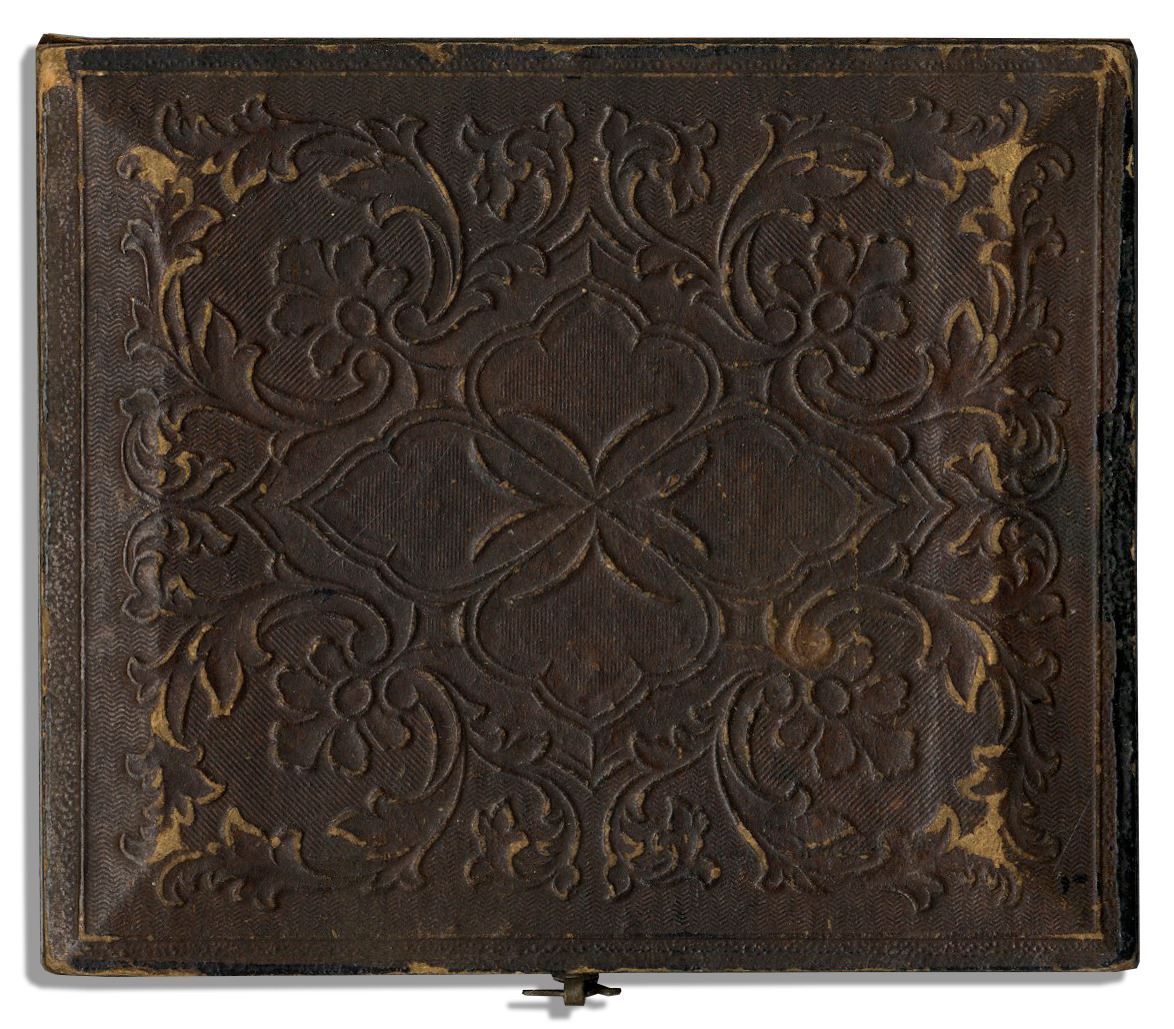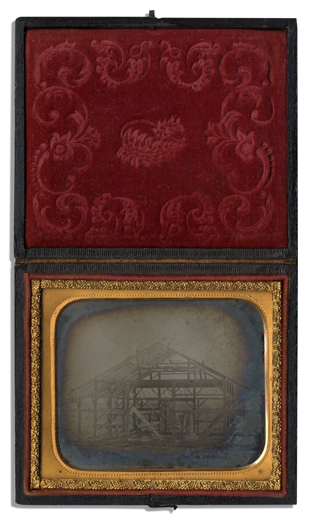 Rare architectural ambrotype from the mid-1800s of a building structure under construction with men standing at the center of the structure and on its roof. Sixth-plate ambrotype is housed in a full, intact case with red velvet interior. Case measures 3'' x 2.25'' with ornate designs and slight wear overall. Hinge closure is perfectly intact. The image is clear with light spotting and foxing to edge of photos. Rare architectural image.