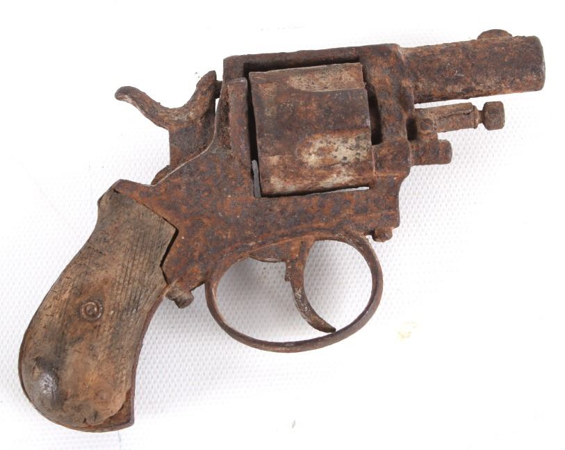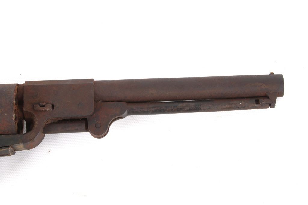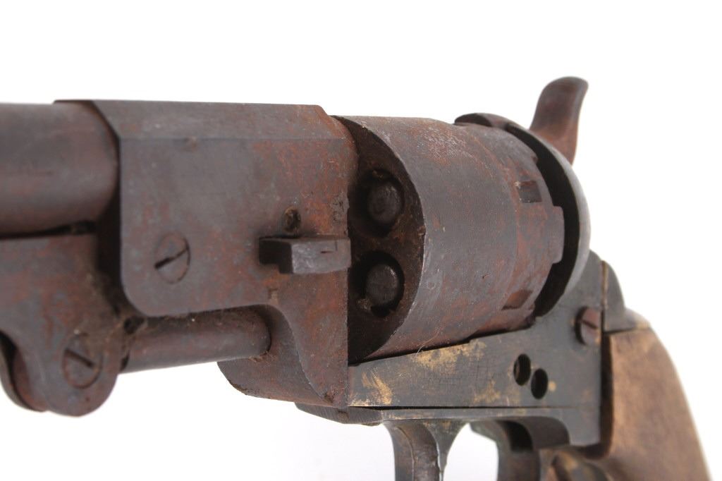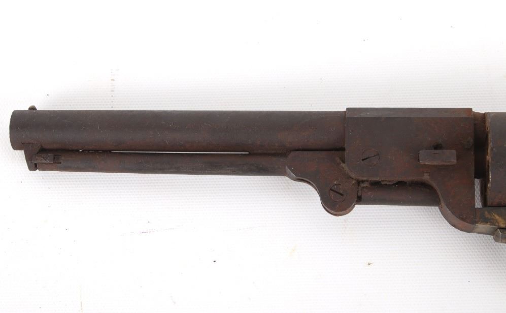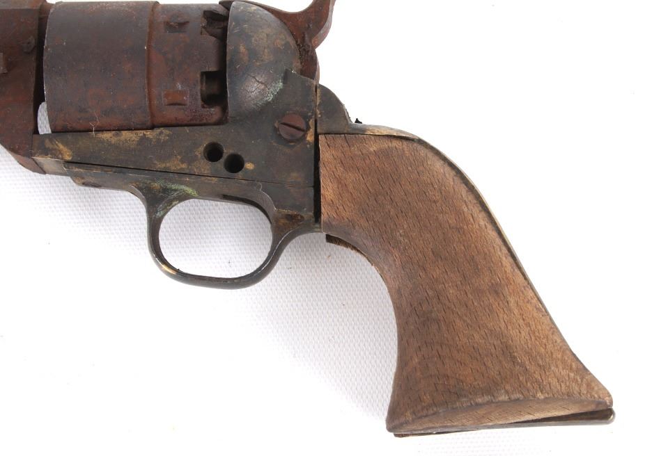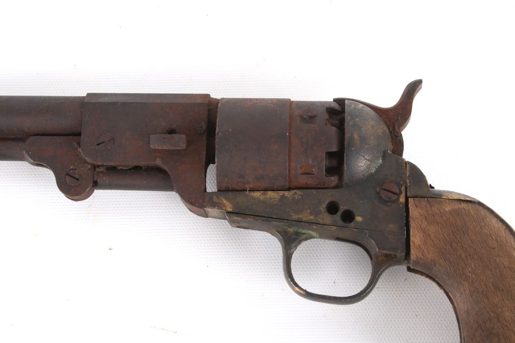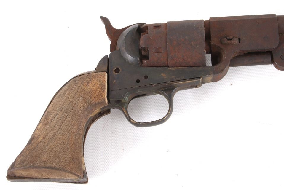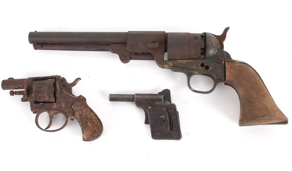Featured in this lot we have a collection of unmarked revolvers and a steel toy pop gun originating from the 1800's. The first revolver is a reproduction Navy Arms revolver with a worn walnut grips, 7 1/4" round barrel, and rusted frame. The revolver is shown loaded with old rounds and missing its trigger with no working action. The second piece is an unmarked short barrel pocket revolver with rusted frame, 1 1/2" long barrel, and worn wood grips. The final piece is a metal spring operated pop gun toy. The collection shows fair condition with wear and weathering due to age.