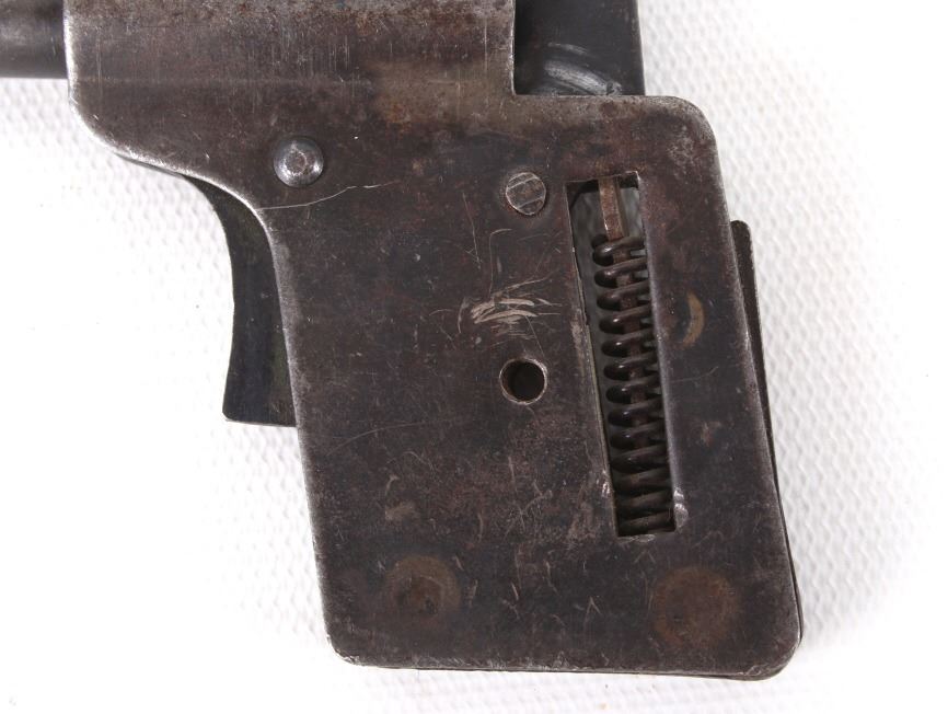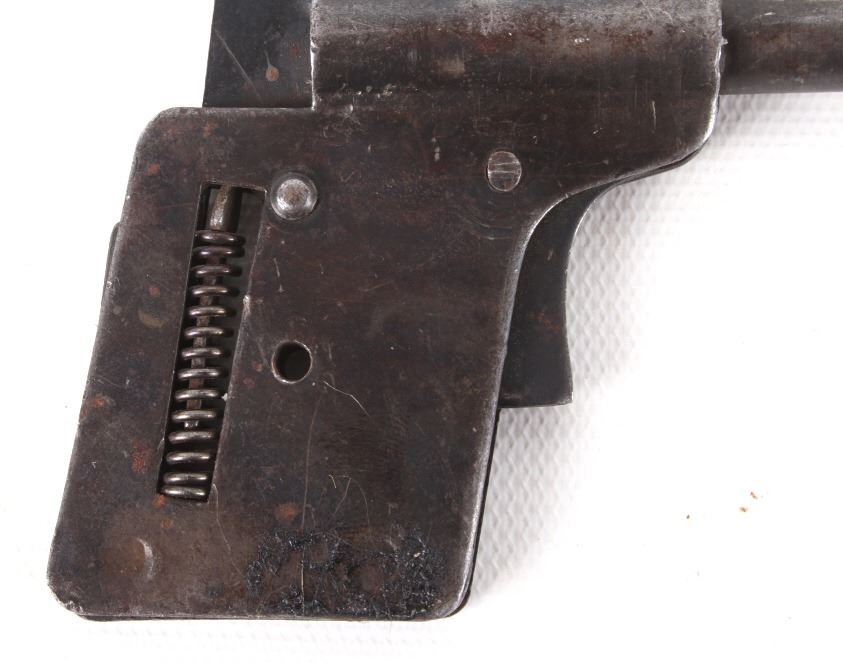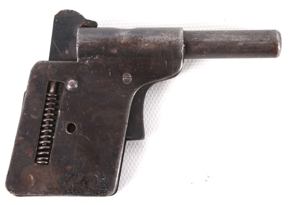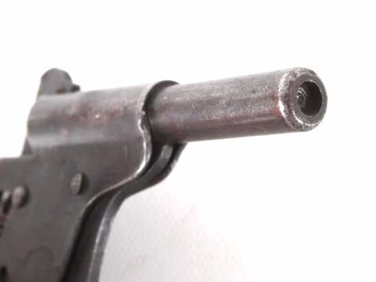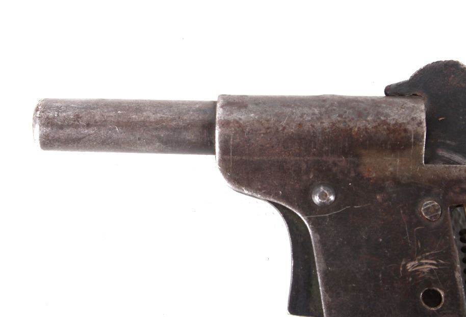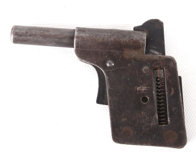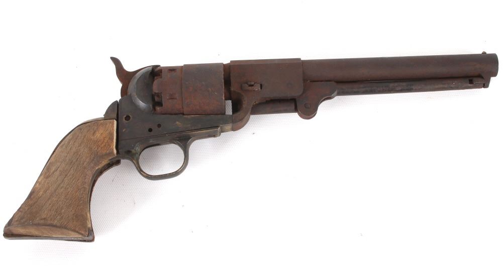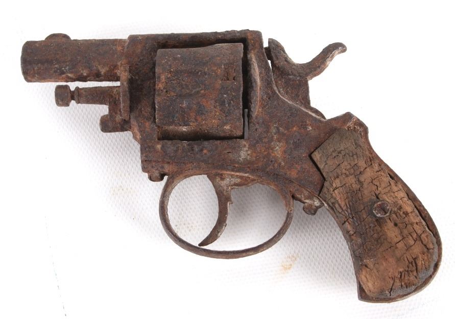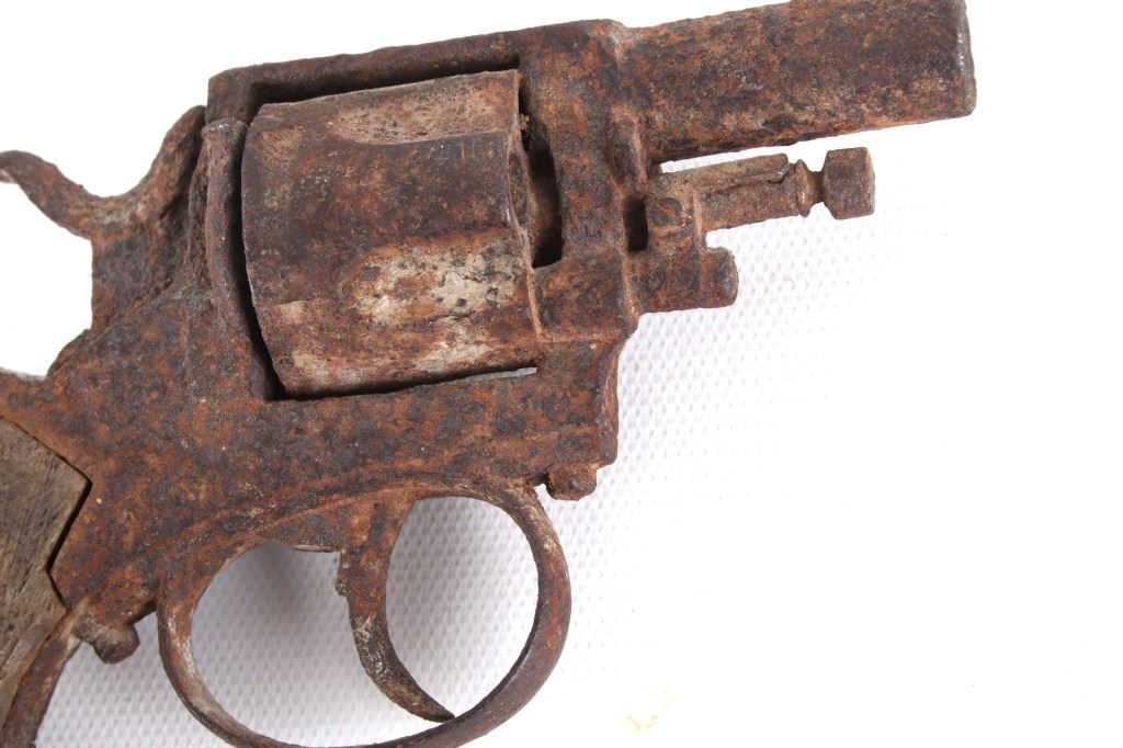 Featured in this lot we have a collection of unmarked revolvers and a steel toy pop gun originating from the 1800's. The first revolver is a reproduction Navy Arms revolver with a worn walnut grips, 7 1/4" round barrel, and rusted frame. The revolver is shown loaded with old rounds and missing its trigger with no working action. The second piece is an unmarked short barrel pocket revolver with rusted frame, 1 1/2" long barrel, and worn wood grips. The final piece is a metal spring operated pop gun toy. The collection shows fair condition with wear and weathering due to age.