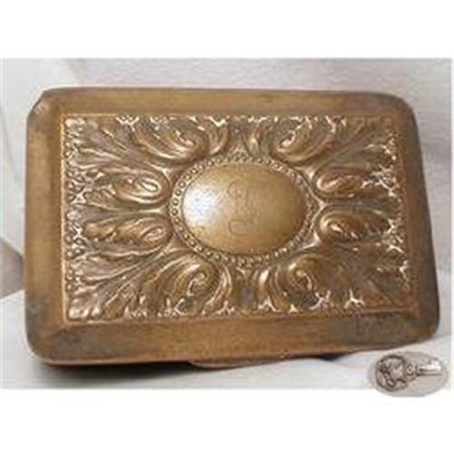 This is for an antique mixed metal ( brass top and sterling bottom ) hallmarked hinged box with its original signed and hallmarked KEY ( which works too by the way). I was told it was possibly a Eoff & Shepherd because it is marked E& S. The mark on the box it identical to the lion and the marks on the key ( see photo) . If anyone has any info on this I will be glad to add it to this limited info I have at this time. The inside is lined with deep blue velvet. The box is really heavy ( 292 grams) and measures 5 ¼" x 3 1/3" and is 2" tall. The top is repousse with fleur delis like leaves on the top. It is larger than a trinket box so I am not really sure what it would have been used for. I know it has the initial D on the top so it actually had an owner at one time who took good care of it. The only tiny ding is on the one corner. It is so well built it must have been meant to really protect its contents because if you didn?t
