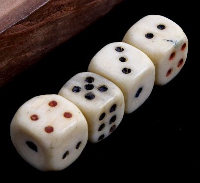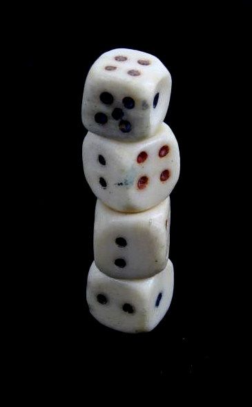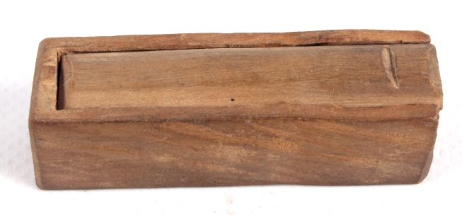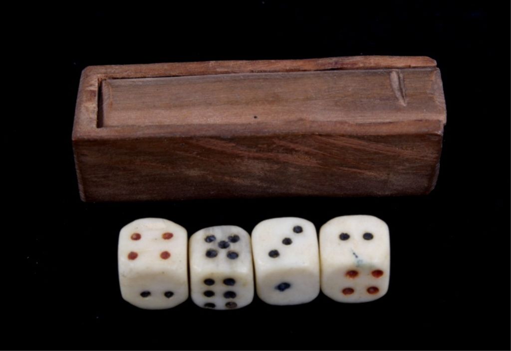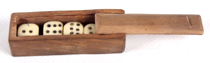 The lot features an original hand crafted set of solid bone or ivory minature dice and a small solid wood carved box. This piece is from the 1800's and is a rare and unique item. The wood box measures 7/16"x1.5" and 7/16" tall. Each dice is unique, but approximately measure 1/4" square.