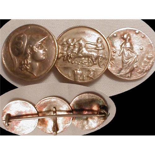 This is a rare hallmarked three coin brooch with hook for a watch, fob or a necessary. I have seen ones like this in a lot of the antique jewelry books. This is all original and the coins include two roman and one that is of a victorian woman looking at the stars. THere is a lot of writing on the hook but I can't make enough of it out to help in finding its origin or maker. This measures 2" long and other than a light polishing on the back, is in great condition.