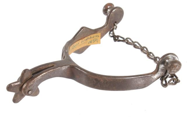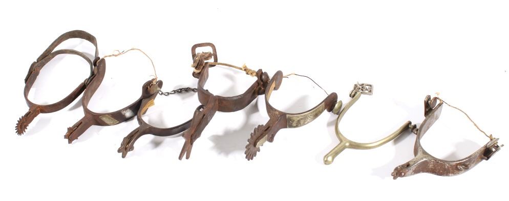For you consideration in this lot we have a collection of assorted single western spurs originating from the 19th century to the mid 20th century. The collection consists of a total of seven spurs with varying degrees of ornamentation. The first of the spurs shows steel construction with thin leather straps and is marked "Sol Kenny 1954". The second and third spurs show iron construction with a six and five pointed rowel and are marked "Charles R Smith 1959". The fourth shows steel construction and is marked "Bill Widdon 1959". The fifth piece shows iron and silver construction and is marked "Sol Kenny 1959 Mr Warf 1880".The sixth spur is a WW1 Cavalry spur and is marked "U.S. W.L." indicating it was made by Whitehorse Lecompte. The final spur shows steel construction with small five point rowel and is faintly marked. The collection shows good to fair condition overall with rust spots and wear due to age and use. The largest spur measures 7 1/2" long by 4 3/4" wide.