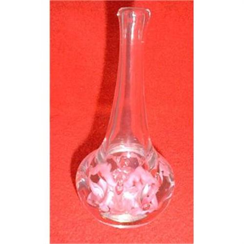 This is a very pretty paperweight vase that I would say is from the late 1800s to the early 1900s. It is 7" tall and about 3" round. Beautifully done in pink with clear teardrops. It is in good condition with no chips or cracks. I bought this from a person I have been buying alot of pieces from in the last few months. All the items have been stored since the 1940s when his grandmother closed her antique shop in NJ and moved to Florida. It had never been unpacked or rewrapped until he brought it in in the original 1940s newspaper. Everything I have bought has been from the mid 1800s to early 1900s. Most of it mid to late 1800s. There is absolutely no doubt about this rare and wonderful piece.