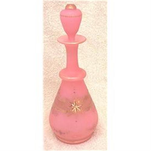 This is a beautiful pink satin art glass cologne bottle from the Late 1800s to the Early 1900s. I would say that it is hand painted in raised enamels of gold and purple. It is about 9" tall and has its original stopper. It is in excellent condition with only very minor gold wear. Which does not detract from this fine piece. I bought this from a person I have been buying alot of pieces from in the last few months. All the items have been stored since the 1940s when his grandmother closed her antique shop in NJ and moved to Florida. It had never been unpacked or rewrapped until he brought it in in the original 1940s newspaper. Everything I have bought has been from the mid 1800s to early 1900s. Most of it mid to late 1800s. There is absolutely no doubt about this rare and wonderful piece.