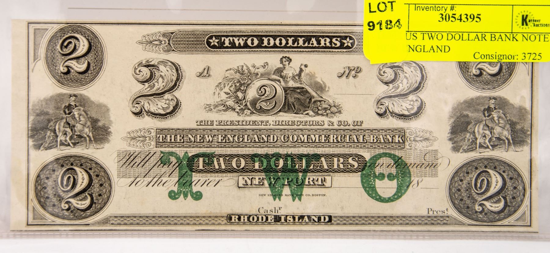 1800S US TWO DOLLAR BANK NOTE NEW ENGLAND