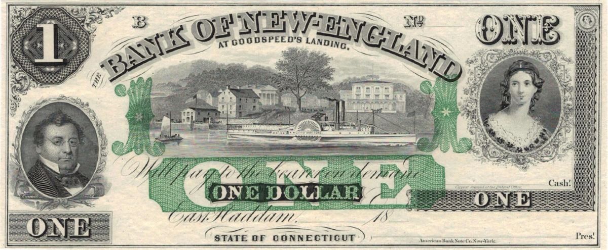 One 1800s $1 Bank of New England Goodspeed's Landing CT Obsolete Currency Note.