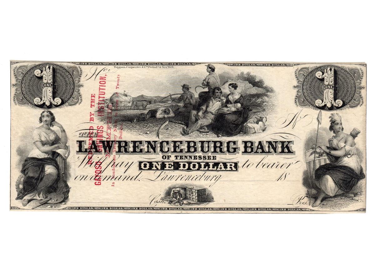 One 1800s $1 Lawrenceburg Bank of Tennessee Obsolete Note.