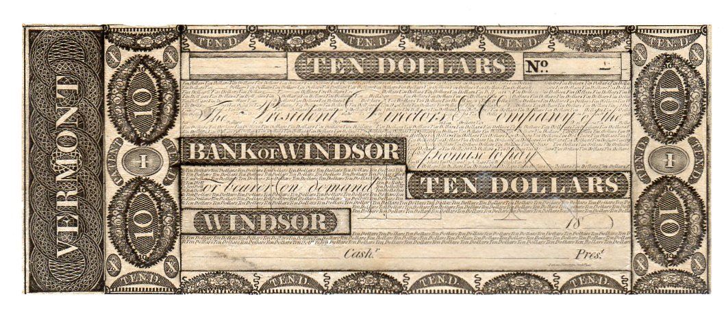 One 1800s $10 Bank of Windsor Vermont Obsolete Bank Note.