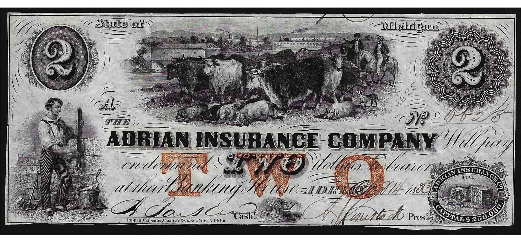 One 1800s $2 Adrian Insurance Company Obsolete Note.