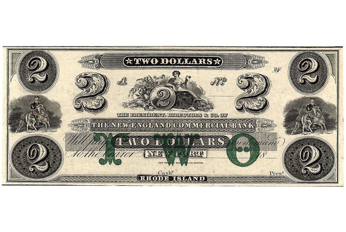 One 1800's $2 New England Commercial Bank Obsolete Currency Note.