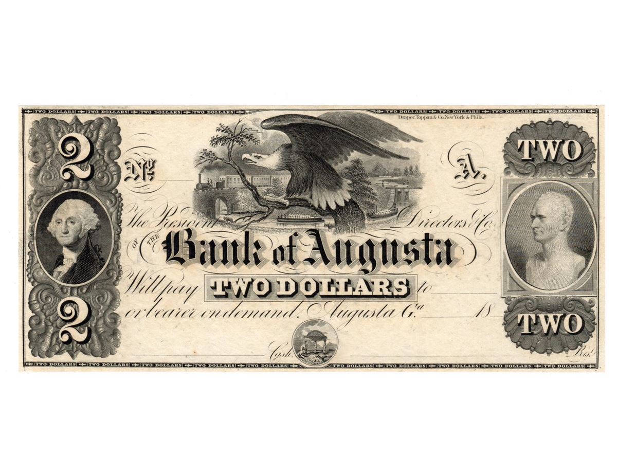 One 1800s $2 The Bank of Augusta Obsolete Bank Note.