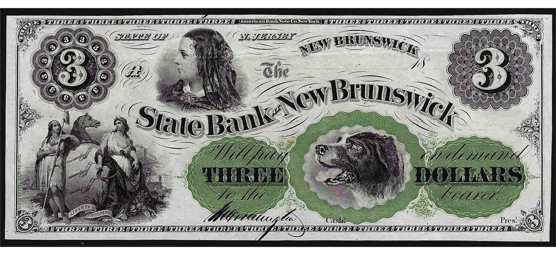 One 1800s $3 State Bank of New Brunswick Obsolete Bank Note.