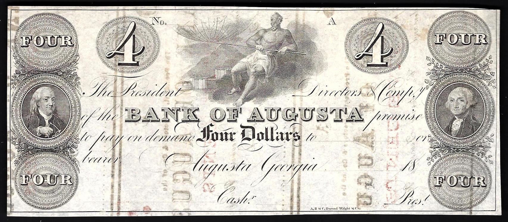 One 1800s $4 The Bank of Augusta Obsolete Bank Note.