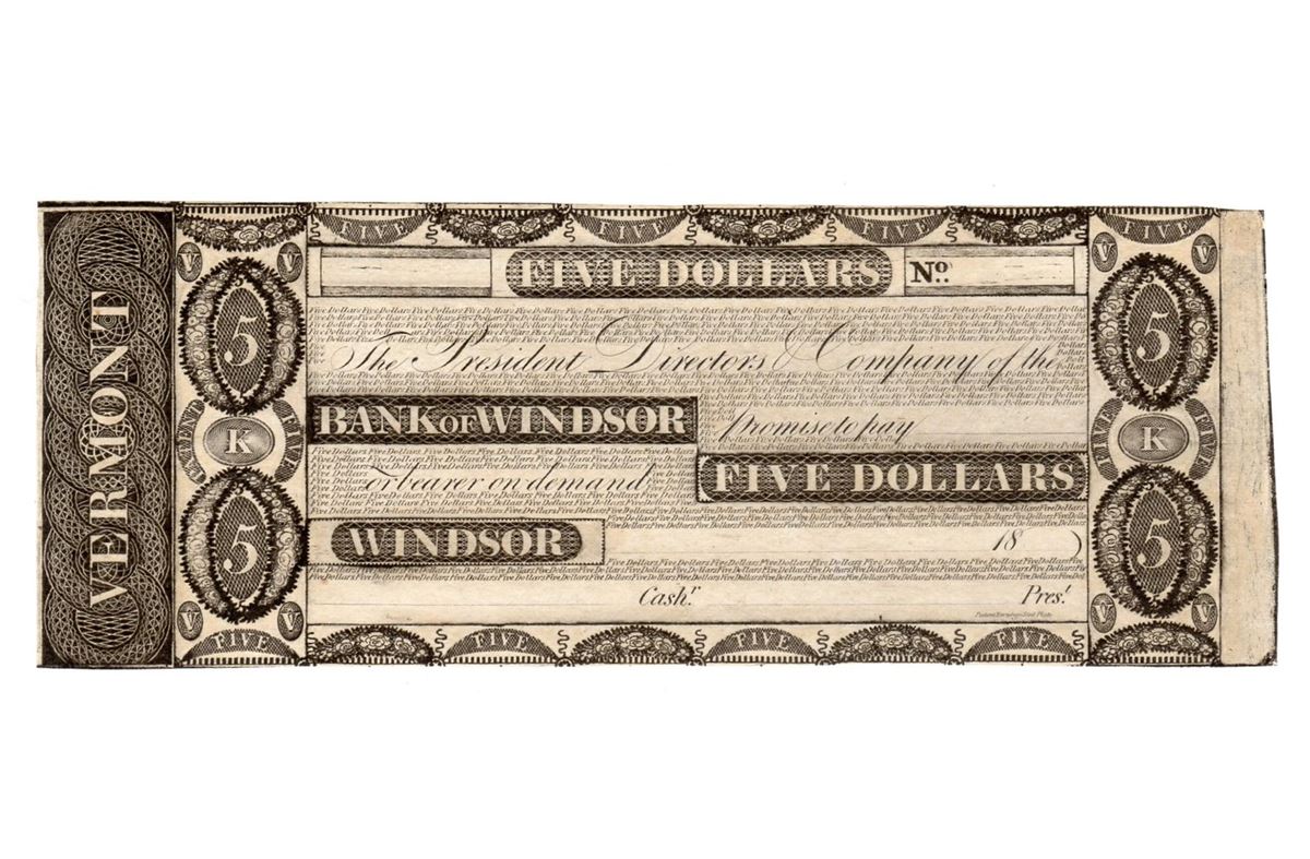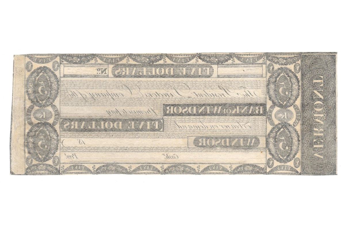 One 1800s $5 Bank of Windsor Vermont Obsolete Bank Note.