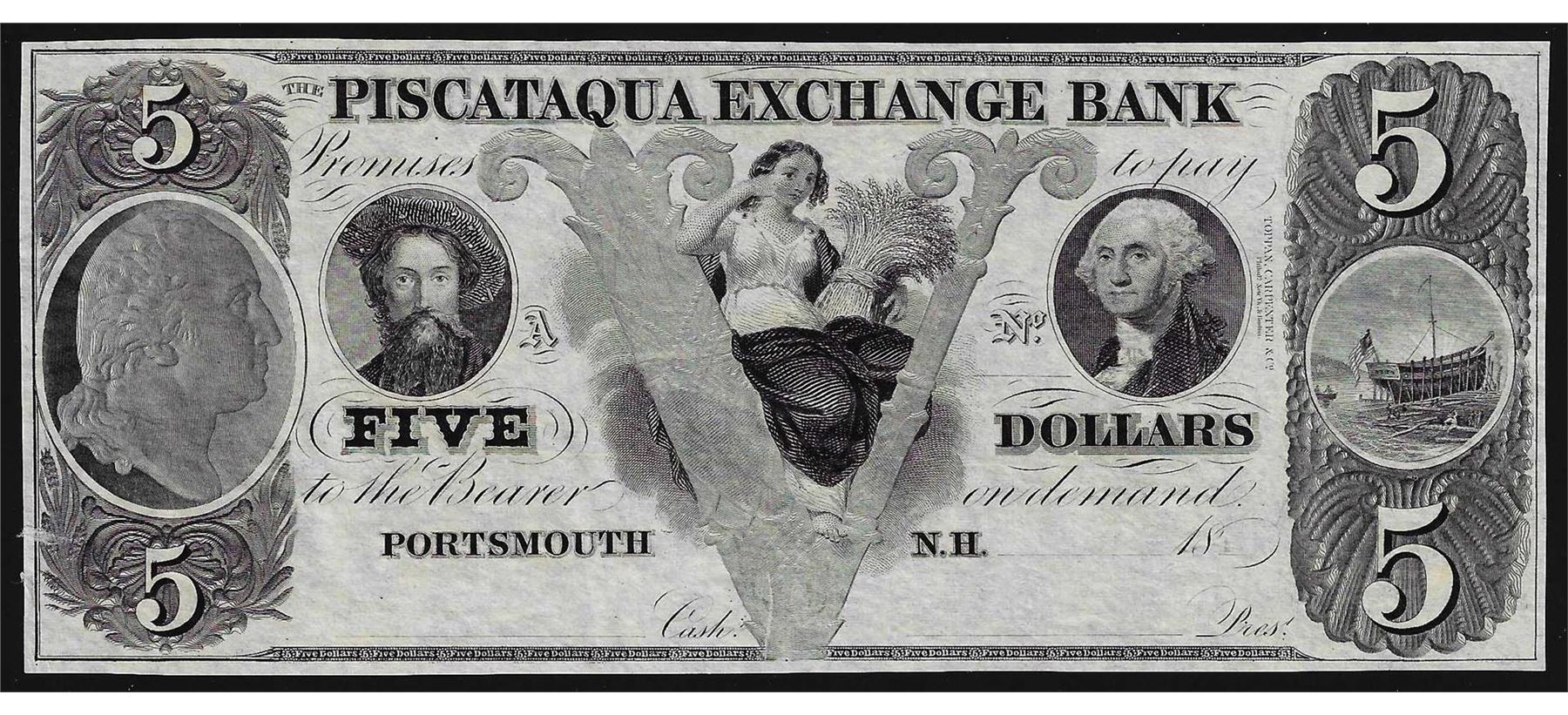One 1800s $5 Piscataqua Exchange Bank Obsolete Note.