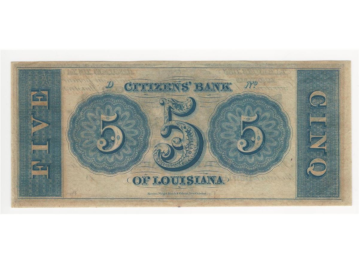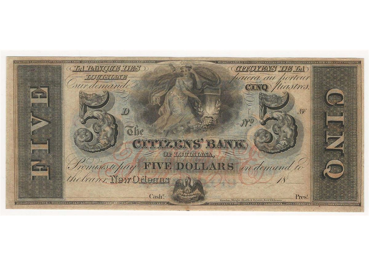 One 1800s $5 The Citizens Bank of Louisiana Obsolete Bank Note.