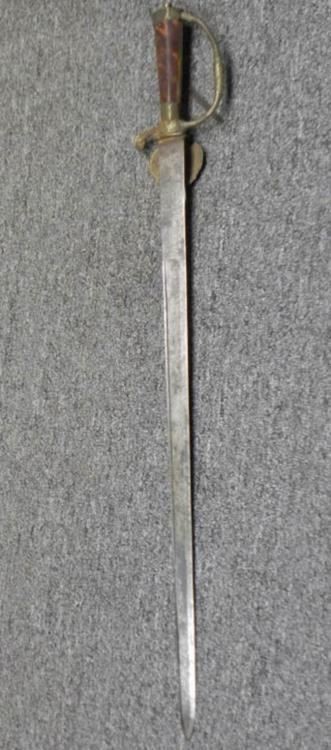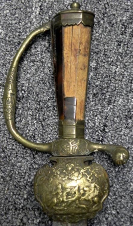 OFFERED HERE IS A 1800's GERMAN HUNTING HIRSCHFANGER-TORTOISE GRIP-CLAMSHELL-HAND ETCHED. THIS OUTSTANDING OLD HUNTING CUTLASS FROM THE EARLY 1800'S GERMANY--FANCY SCALLOPED POMMEL---TORTOISE COVERED GRIP--A SECTION OF TORTOISE IS MISSING--HANDGUARD HAS ANIMALS DRESSED LIKE HUNTERS (GREAT HUMOR)--CROSSGUARD HAS DEER AND BOAR--GREAT CLAMSHELL HAS HUNTERS ON HORSEBACK WITH DOG AND DEER--SURROUNDING AREA IS VERY FANCY AND DETAILED---21 1/2" LONG BLADE--IS HAND ENGRAVED ON BOTH SIDES-ONE SIDE WITH A DEER AND FILEGREE AND THE OTHER WITH A BOAR AND FILEGREE--NEEDS A LITTLE TLC AND YOU WILL HAVE AN OUTSTANDING HUNTING CUTLASS.