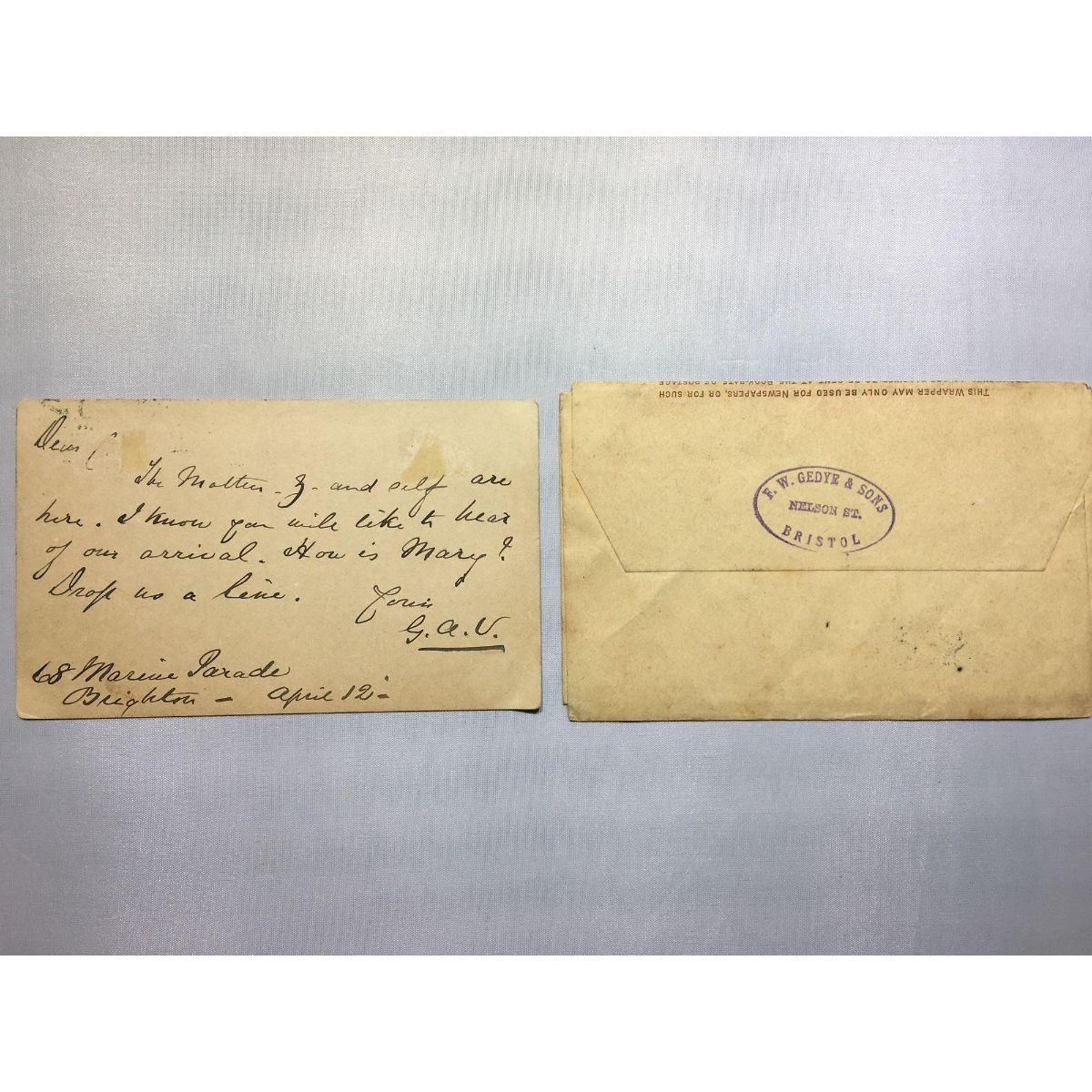 Portsmouth stamped original iron gall handwritten post card and envelope now in a protective sleeve with a British pennystamp.Â