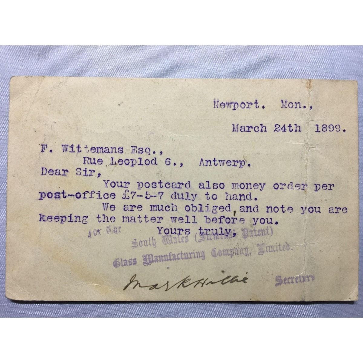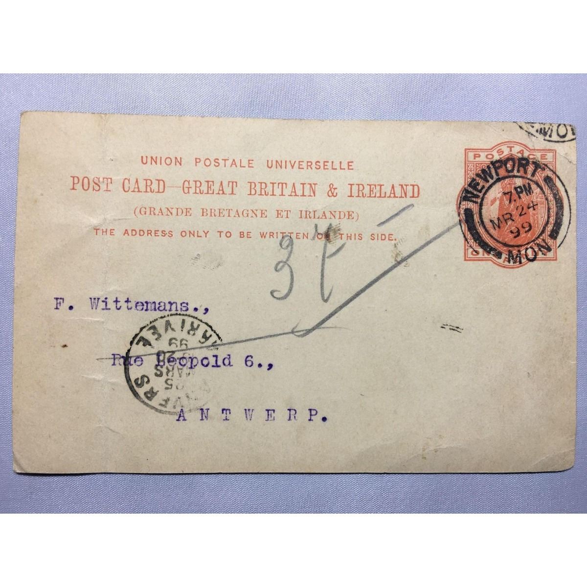 Newport stamped original typed post card now in a protective sleeve with a British pennystamp. This typed post card was sent to F. Wittemans of an Rue Leopld 6, Antwerp Belgium address.Â