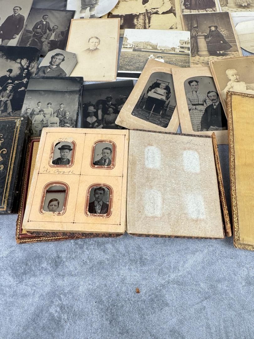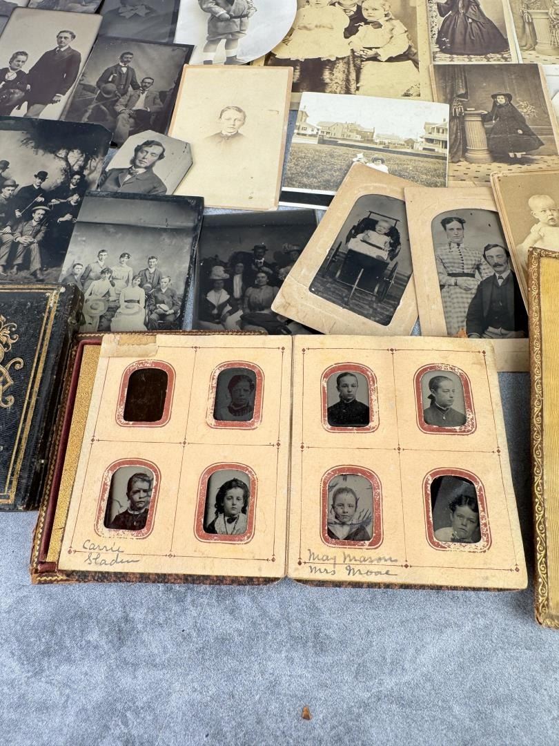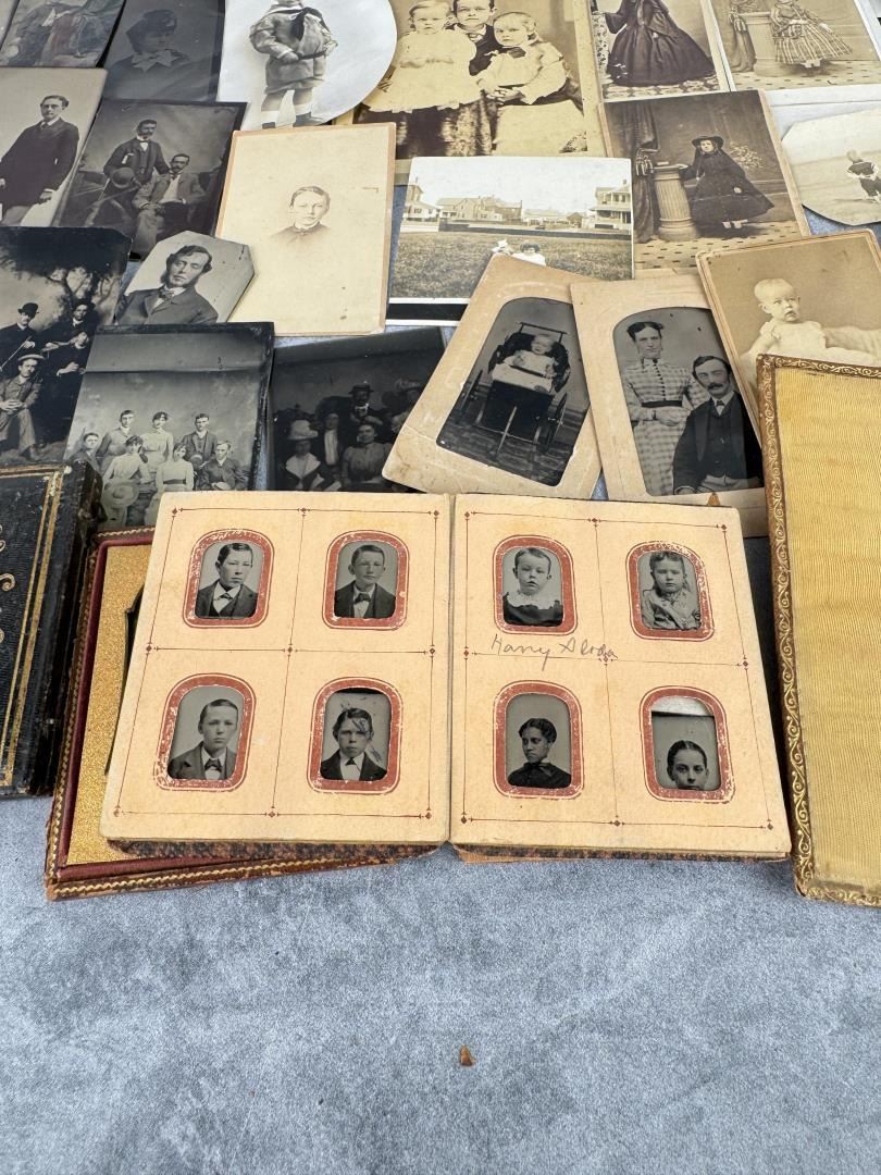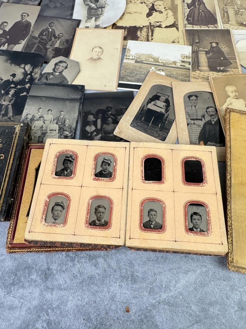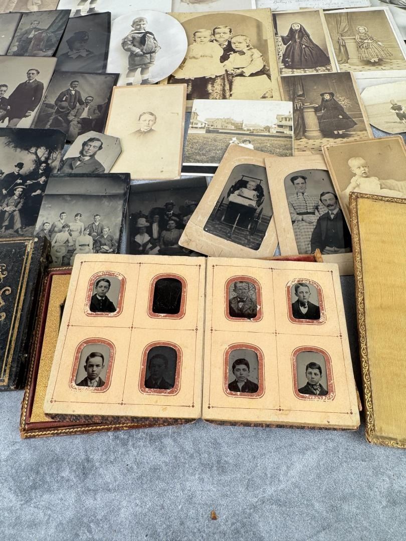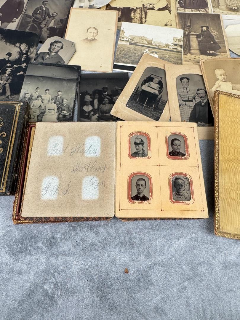 97 total photos, the largest measures 8" by 5". Large grouping of tintypes, cabinet cards, CDVs, and other photos of the family of Civil War hero Joseph Alton Sladen