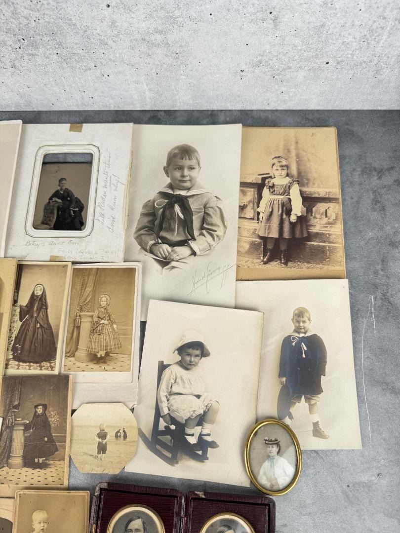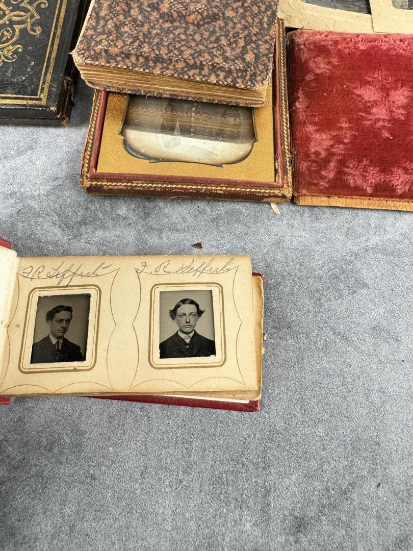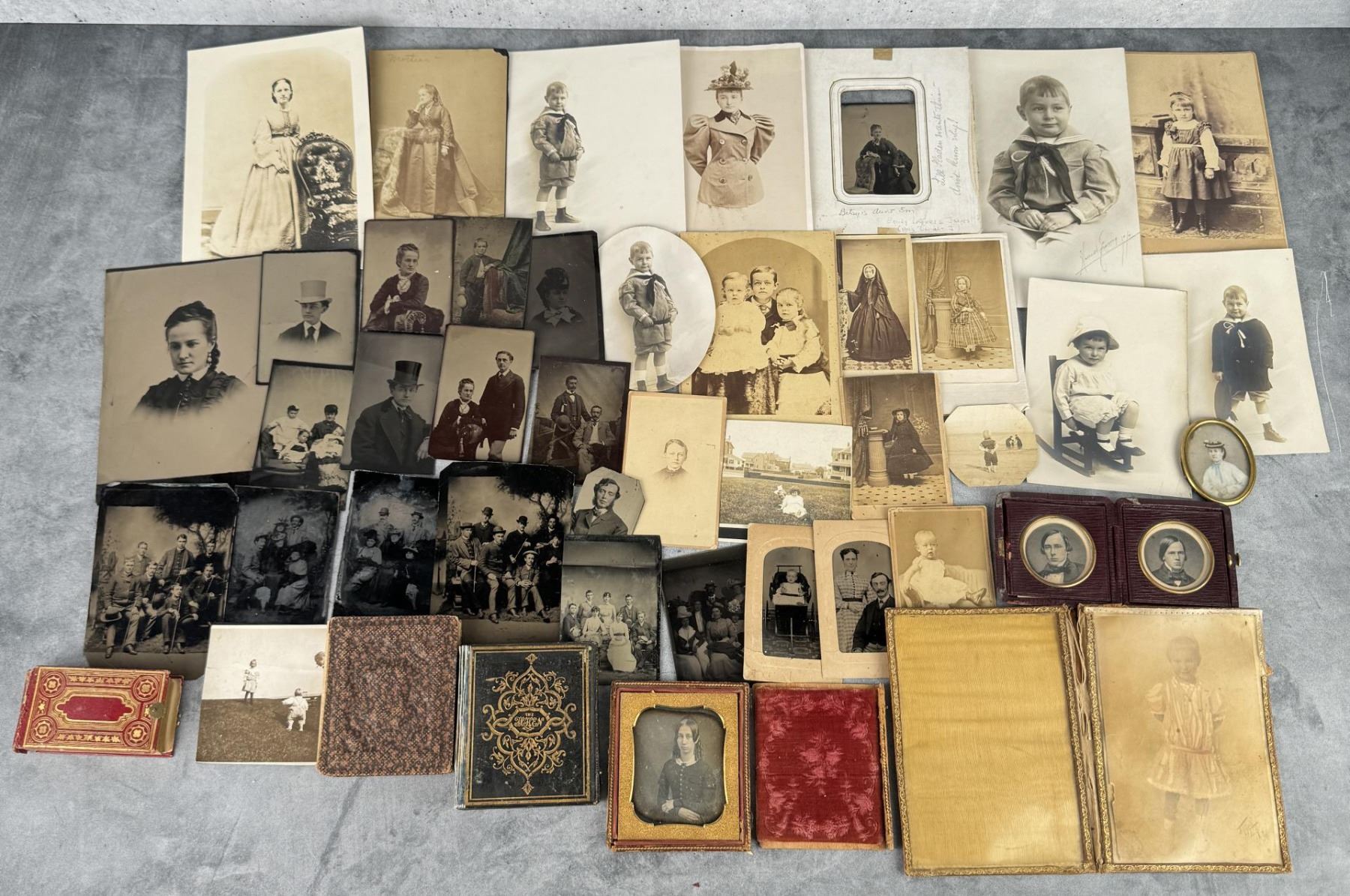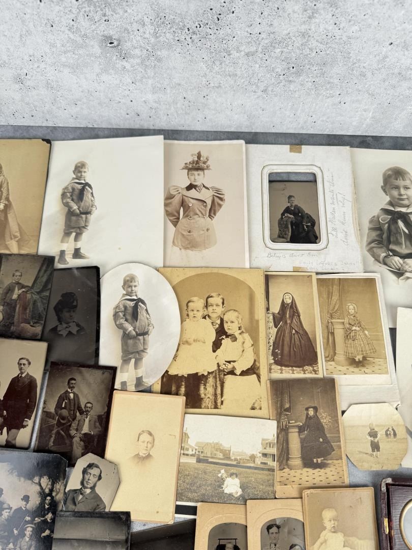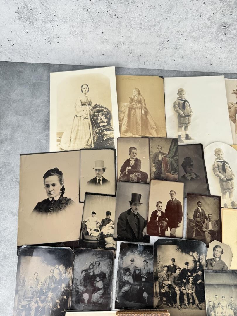 97 total photos, the largest measures 8" by 5". Large grouping of tintypes, cabinet cards, CDVs, and other photos of the family of Civil War hero Joseph Alton Sladen