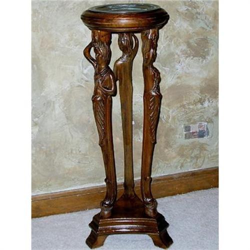 THERE ARE 3 FULL FIGURED ELEGANT CARVINGS OF AFTRICAN/EGYPTIAN WOMEN WITH ARM STRETCHED UPWARD HOLDING THE BASKET ATOP THEIR HEADS WHICH SUPPORT THE SHELF PORTION OF THIS WONDERFUL PIECE! EVEN THE ORIGINAL SILVER ENGRAVED PLATE IS STILL HERE! THERE IS SOME STUNNING PATINA THROUGHOUT THE PIECE. WE HAVE NOT TOUCHED THIS IN ANY WAY!