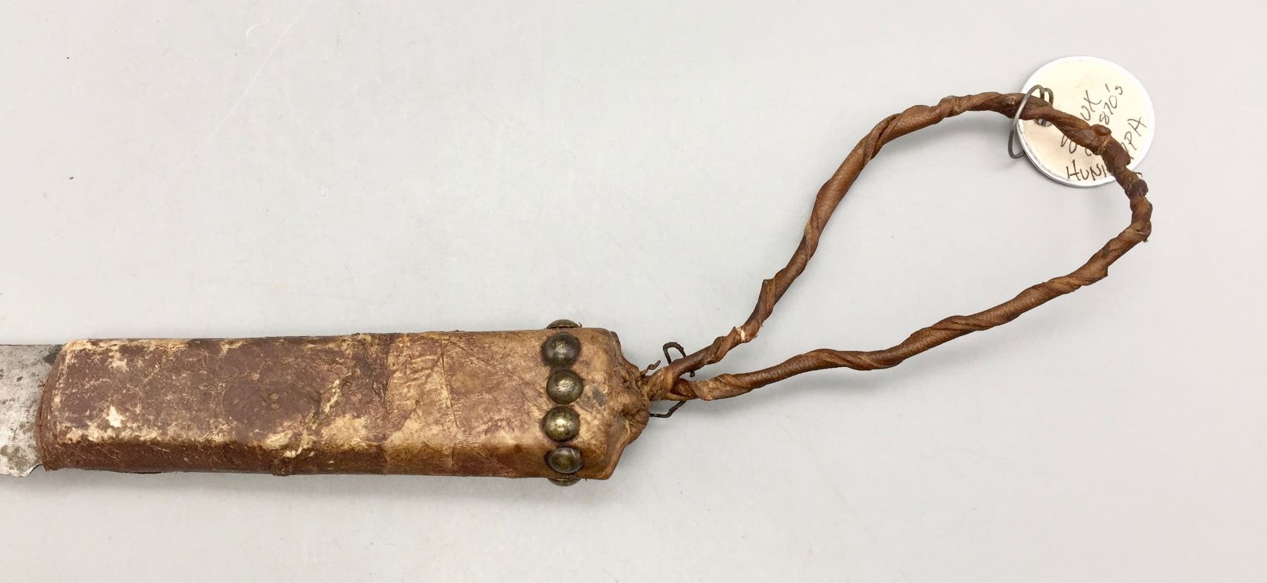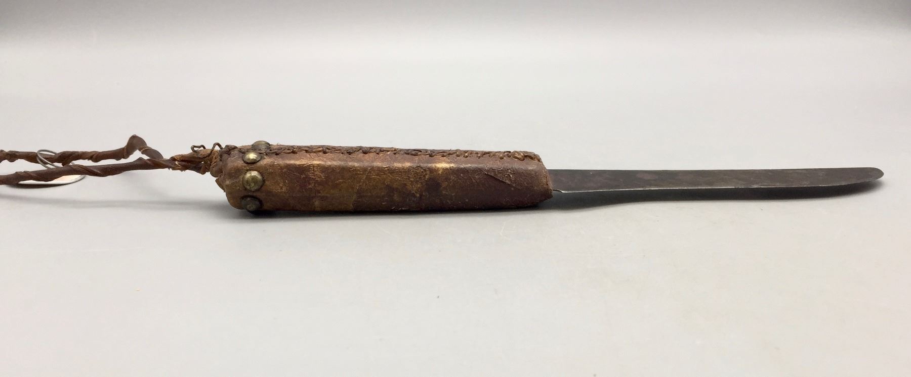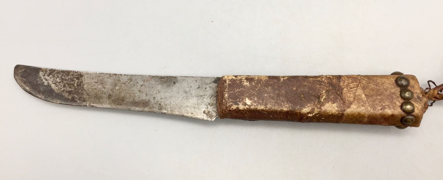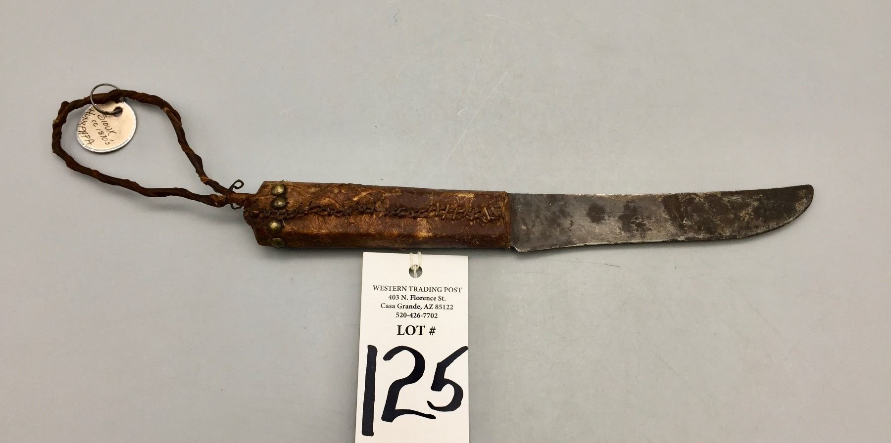 Description: Offered for sale in this lot is an 1800s tacked and rawhide covered knife. It was said to have been “found” on a trail in South Dakota, the same trail used by the Lakota's as they migrated back and forth to the north. This is the same trail Sitting Bull and his group would have taken in the late 1800s. Maker: Unknown. Approx. Age: Circa late 1800s. Size: 1-1/4”w. Overall length of 15”. Condition: Pretty good for its age, wear expected and “as found.” Please look closely at the pictures - they are an important part of our description. Shipping: There will be a $7 handling / packaging fee for shipping this lot. The actual cost of postage will be added on top of that.
