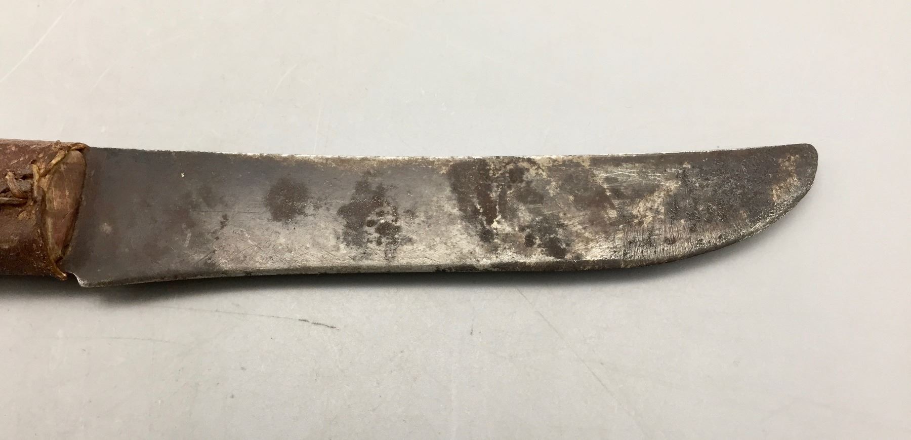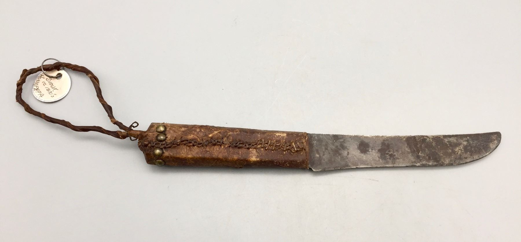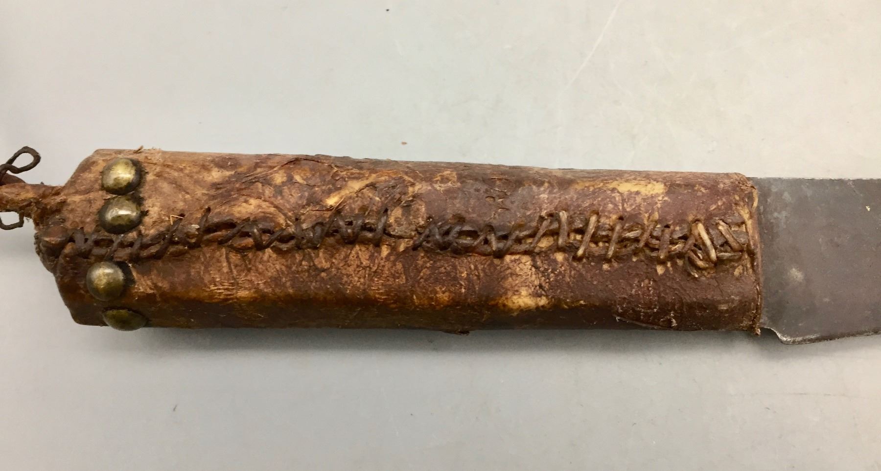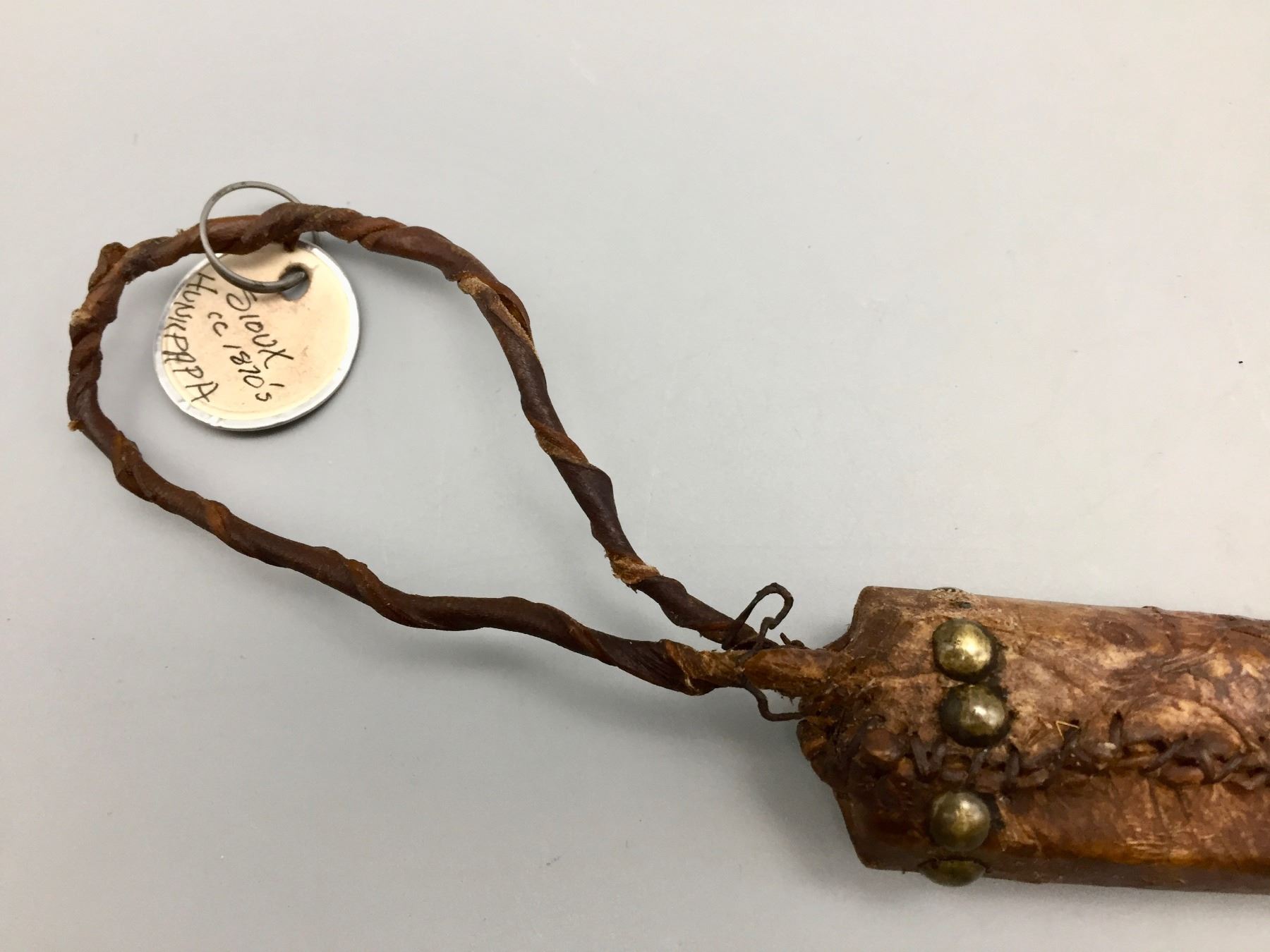 Description: Offered for sale in this lot is an 1800s tacked and rawhide covered knife. It was said to have been “found” on a trail in South Dakota, the same trail used by the Lakota's as they migrated back and forth to the north. This is the same trail Sitting Bull and his group would have taken in the late 1800s. Maker: Unknown. Approx. Age: Circa late 1800s. Size: 1-1/4”w. Overall length of 15”. Condition: Pretty good for its age, wear expected and “as found.” Please look closely at the pictures - they are an important part of our description. Shipping: There will be a $7 handling / packaging fee for shipping this lot. The actual cost of postage will be added on top of that.
