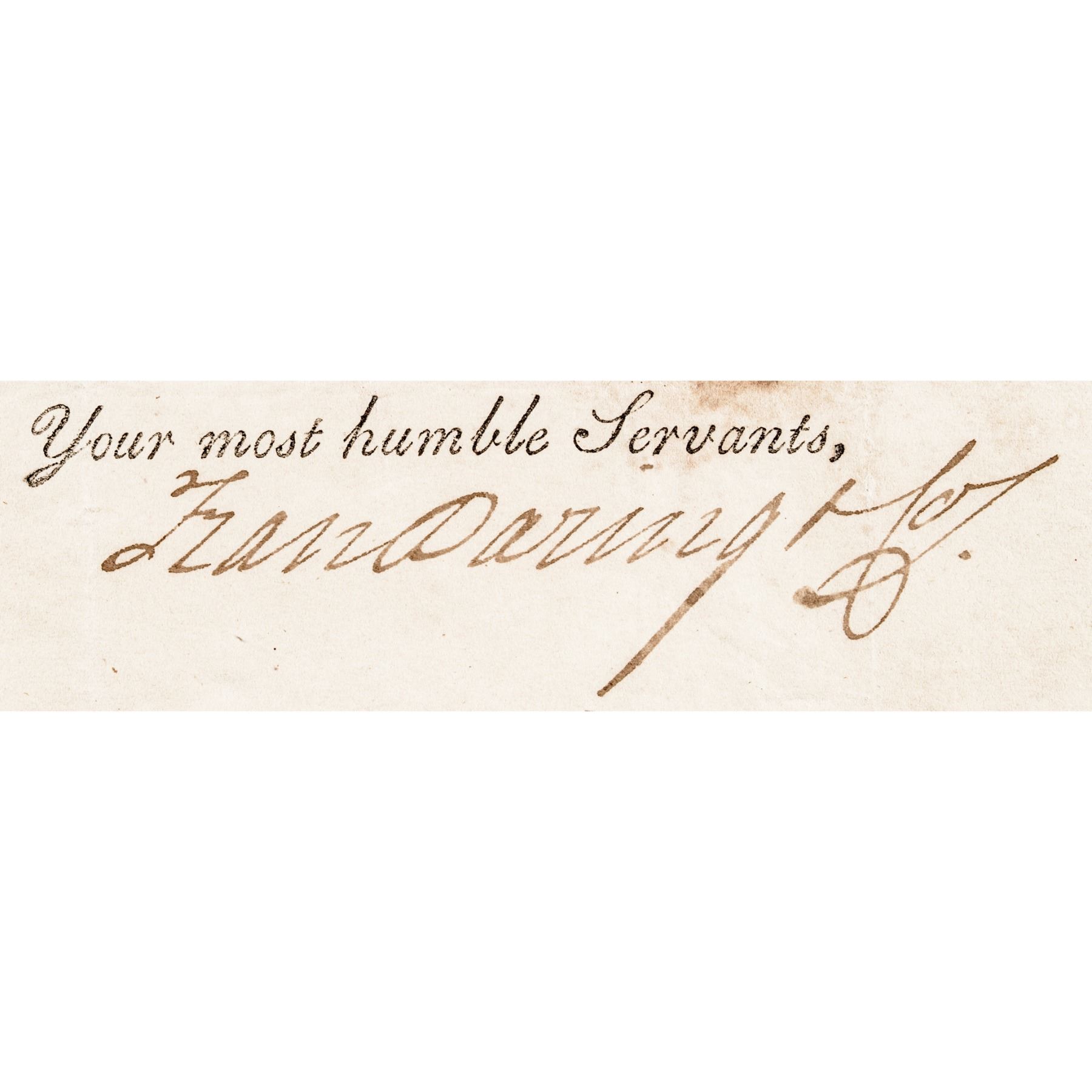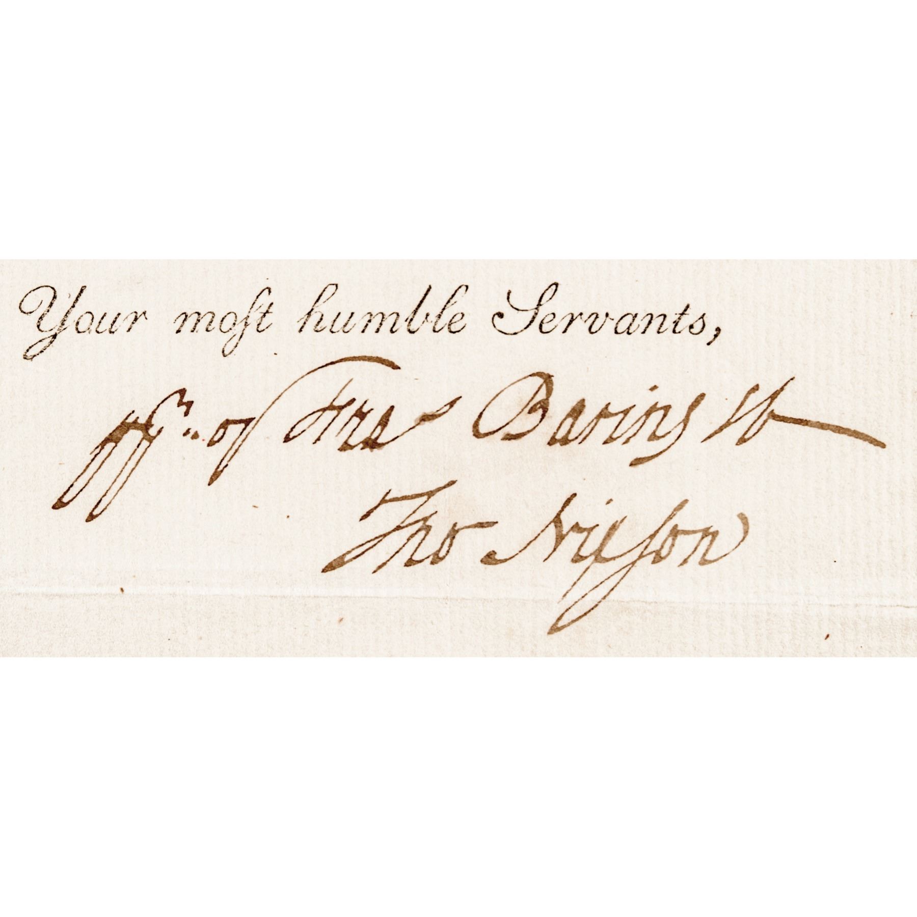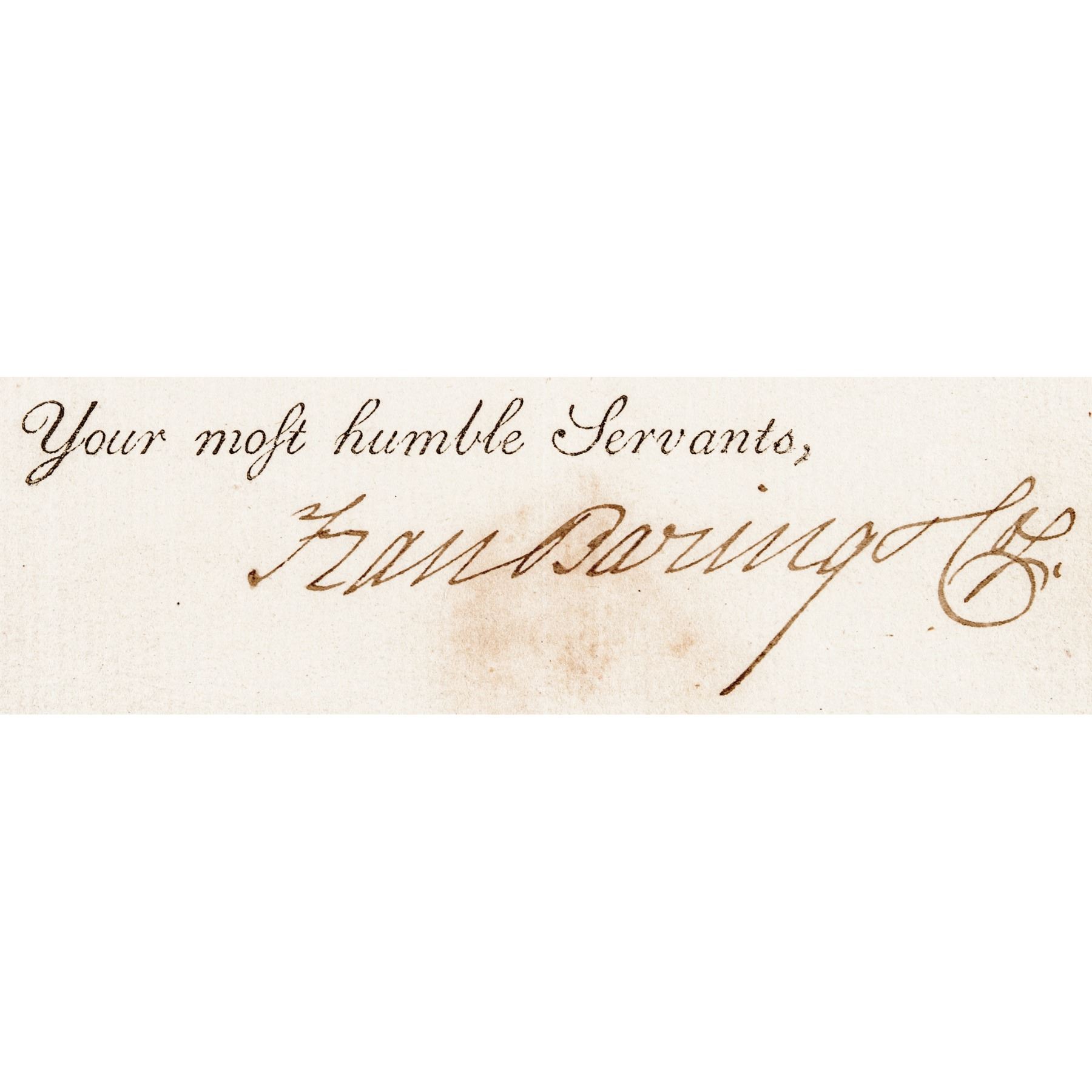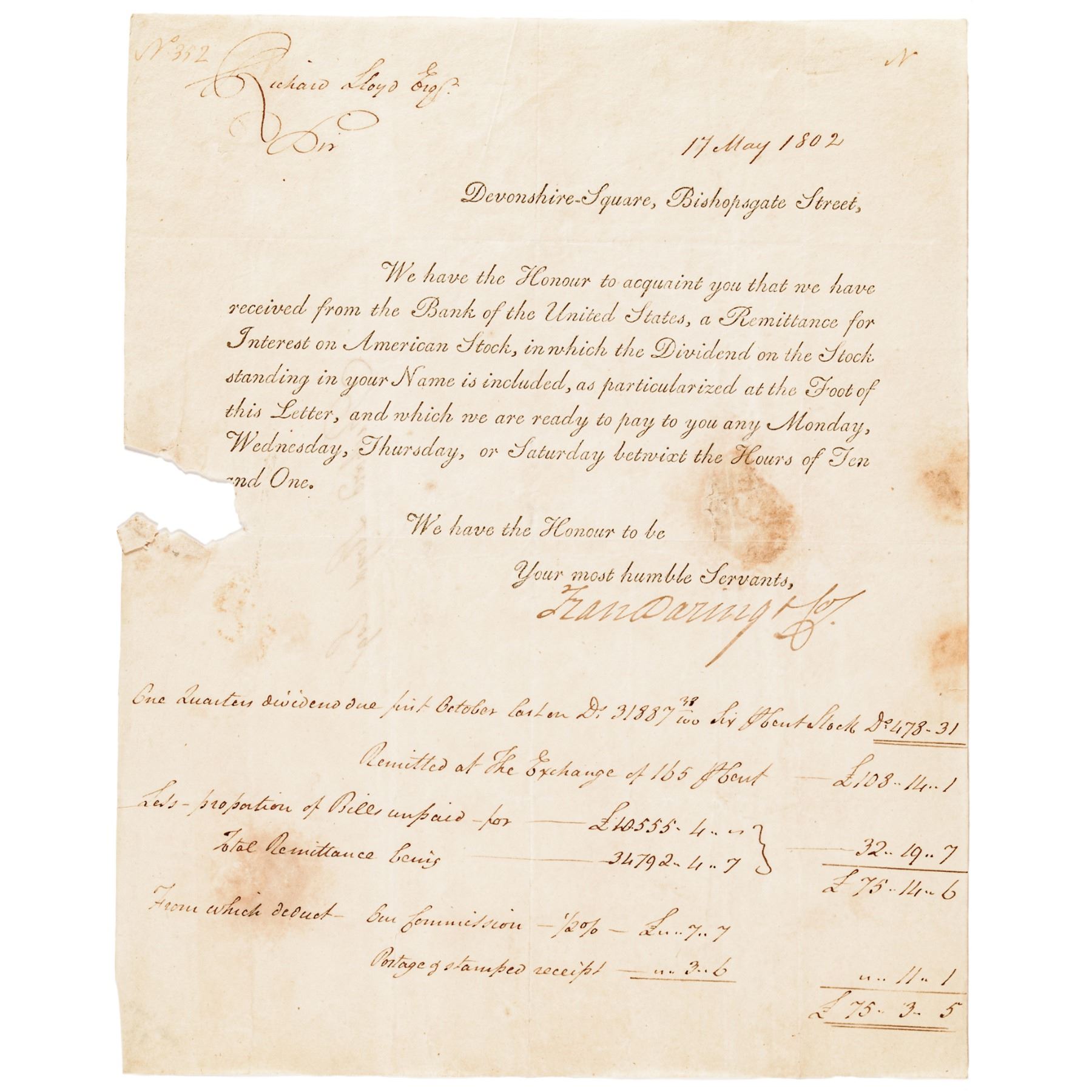 Three rare and unusual, Similar Printed Form Documents, each Signed with the Corporate Officer’s Signature for "Fran Baring & Co." one with added, "Agt. of Fras Baring & Co - Jno Nixson"), 1 page, each measuring 10.5” x 8” located at "Devonshire-Square, Bishopsgate Street." {London}. They are dated; 4 April, 1801; 22 June 1801 and 17 May 1802, all being addressed to "Richard Lloyd, Esqr.". These Financial Disbursement Forms being for the Bank Of The United States Securities in this series of Statements for Baring's clients who had invested in United States securities at the turn of the nineteenth century. Expected postal folds and some marginal wear including a few minor chips and tears when the seal was broken upon opening.