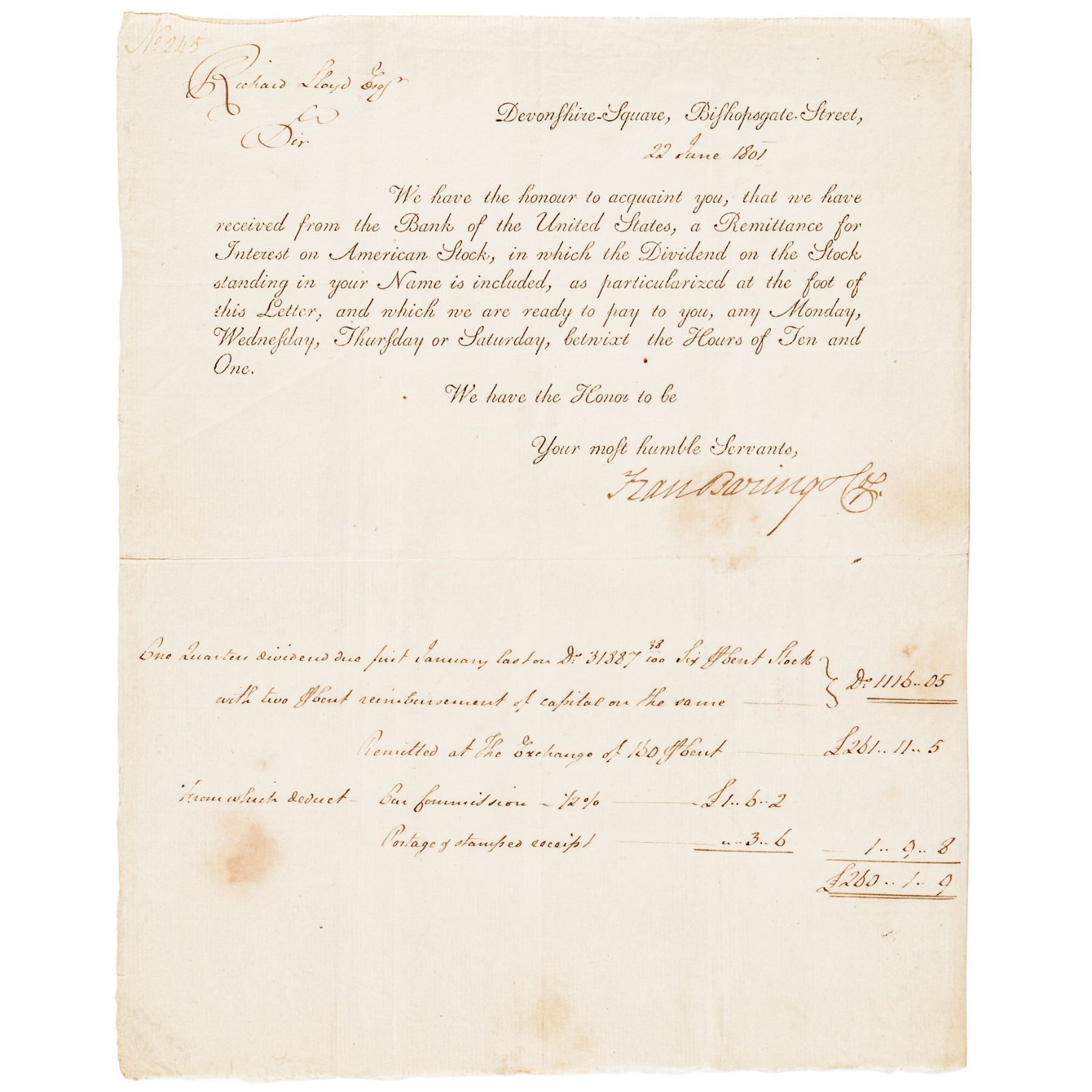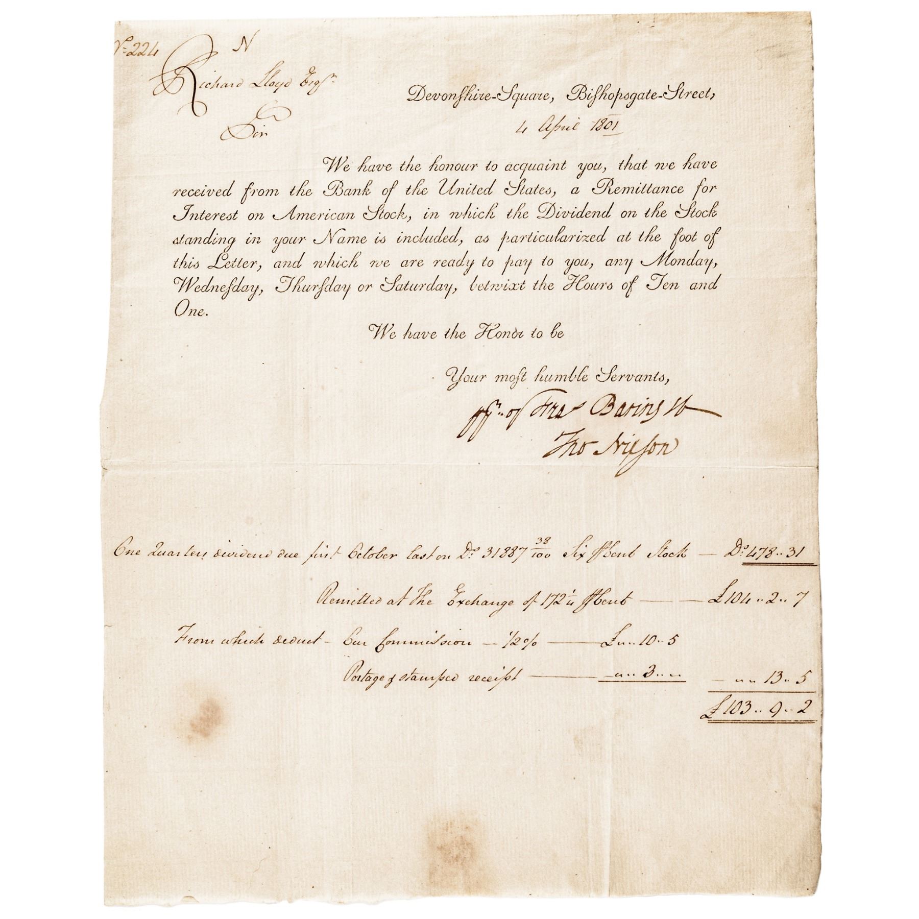 Barings had become a major holder of stock in the Bank of the United States when the U.S. Government sold off its shares in the Bank. In 1803, Barings financed the $15 million Louisiana Purchase by the United States. The same year, the U.S. Government appointed Barings its London agents for the Bank of the United States. The first of these forms we have seen and offered. (3 items)