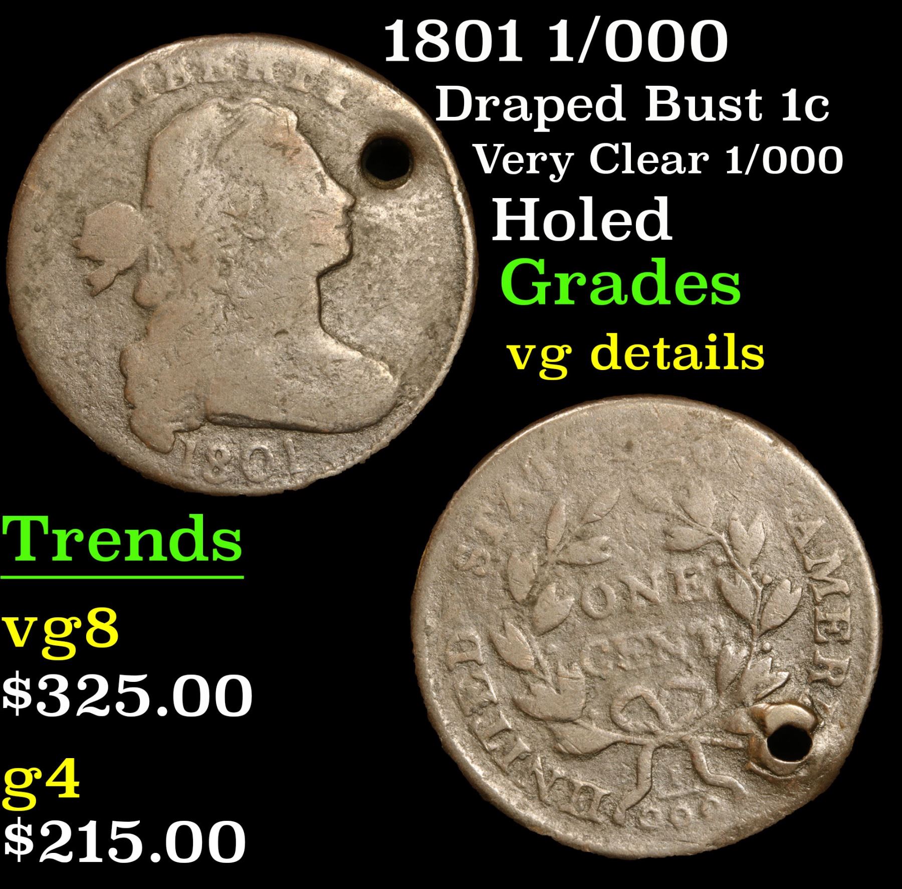 1801 1/000 Draped Bust Large Cent 1c Grades vg details. Very Clear 1/000; Holed