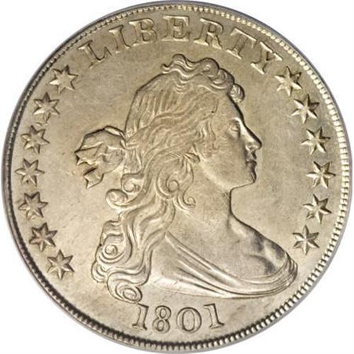 <B>1801 $1 --Improperly Cleaned--NCS. AU Details.</B></I> B-4, BB-214, R.4. Die State III. This is the scarcest 1801 variety, slightly scarcer than the BB-213 that is in second place. In this terminal state, a tiny die crack is seen extending down into the field and slightly to the left from the rim above cloud 6 and to the right of the last S in STATES. The Bowers-Borckardt reference notes that this die state is "five to 10 times scarcer than the preceding." <BR> While this is an obviously cleaned coin, the effect is not all that displeasing, save for somewhat flat, lackluster reverse. The obverse, while brilliant, is not garish or lacking in appeal. A couple of small scrapes are concealed in the hair, but the strike is bold, and in terms of wear the piece shows limited highpoint rub.<BR><I>Ex: A.N.A. Sale (Heritage, 8/96), lot 7974.<BR>From The Queller Family Collection of Silver Dollars.</B></I><BR><BR><b>Shipping:</b> Coins & Currency (<a target="_blank" href="http://www.heritageauctions.com/common/shipping.php">view shipping information</a>)