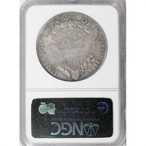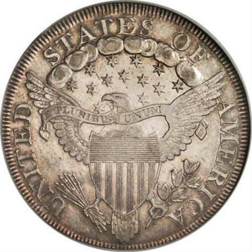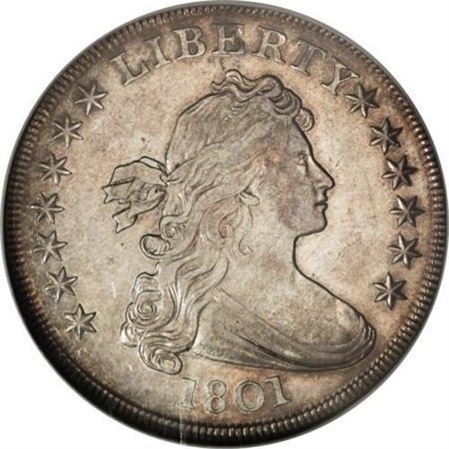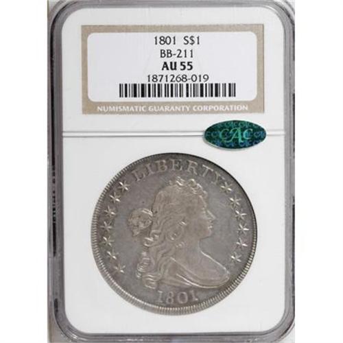 <B>1801 $1 AU55 NGC. CAC. </B></I> B-1, BB-211, R.3. Die State II-III. On the obverse a tiny die line is noted to the left of the date, slanting downward toward the border. On the reverse there is an arcing die crack from the rim above the eagle's left wing, through STA and the clouds, ending at the top of the right wing. This crack is paralleled between the wingtip and S by a second crack just below. There is <I>no sign </B></I>of clashing from the obverse star points at TED, as usually seen in Die State III. Once again, this Queller coin appears to be from an unusual and likely rare die state. This piece displays lustrous, somewhat prooflike surfaces with appealing gray-gold coloration and lots of eye appeal.<BR><I>From The Queller Family Collection of Silver Dollars.</B></I><BR><BR><b>Shipping:</b> Coins & Currency (<a target="_blank" href="http://www.heritageauctions.com/common/shipping.php">view shipping information</a>)