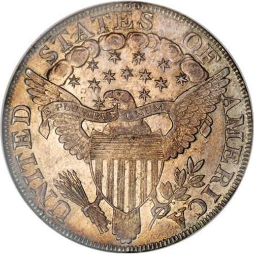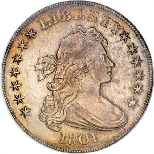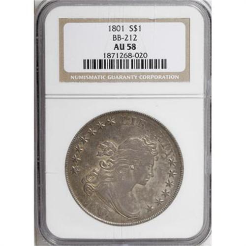 <B>1801 $1 AU58 NGC.</B></I> B-2, BB-212, R.3. Die State II. The "double collar" above the bust of Liberty is diagnostic of this die state, as is the extremely bold incusation of a single cloud above the date, followed by fainter incusations into the obverse left field. On the reverse a tiny die crack extends from the second-highest left wing feather to the rim. LIBERTY and the eagle's tail, in particular, are weakly struck. Bowers-Borckardt suggests this is due to clashing causing misalignment of the faces.<BR> This lovely near-Mint State piece boasts premium appeal, a combination of the consistent, smooth grayish-gold surfaces and a relative lack of any singular signs of contact, save for a tiny field tick before Liberty's nose.<BR><I>From The Queller Family Collection of Silver Dollars.</B></I><BR><BR><b>Shipping:</b> Coins & Currency (<a target="_blank" href="http://www.heritageauctions.com/common/shipping.php">view shipping information</a>)