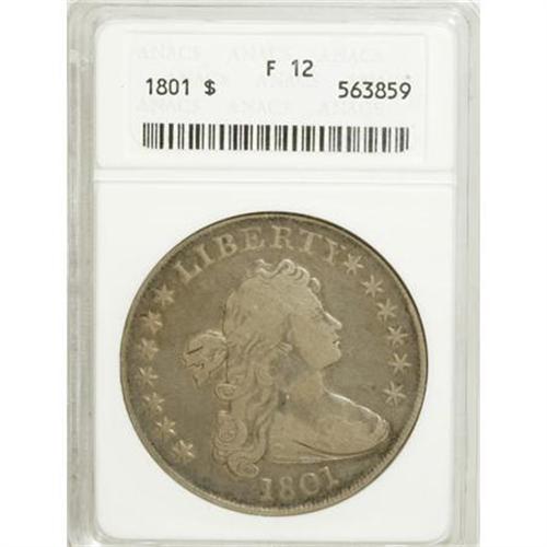 <B>1801 $1 Fine 12 ANACS.</B></I> B-2, BB-212, R.3. Slate and mocha shadings converge on this significantly worn, yet pleasingly defined 1801 dollar. A number of fine marks affect each side, yet the overall eye appeal is solid.<BR><BR><B>Coin Engraver:</B> Robert Scot<BR><BR><b>Shipping:</b> Coins & Currency (<a target="_blank" href="http://www.heritageauctions.com/common/shipping.php">view shipping information</a>)