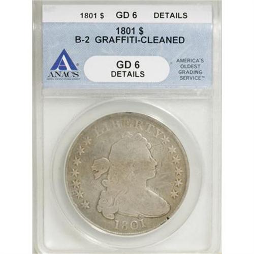 <B>1801 $1 --Graffiti, Cleaned--ANACS. Good 6 Details.</B></I> B-2, BB-212, R.3. The right obverse field exhibits the initials RSM, undoubtedly entered by a proud 19th century owner. The reverse rim has a minor ding at 5:30, and scratches near the rim are noted at 8 o'clock on the obverse and 9:30 on the reverse. A small dig lies above the date, and a scratch is noted on the field above the cleavage. Cloudy from a cleaning. The shield lines are virtually fully separated.<BR><I>From The John Stimson, Sr. Collection, Part Two.</B></I><BR><BR><B>Coin Engraver:</B> Robert Scot<BR><BR><b>Shipping:</b> Coins & Currency (<a target="_blank" href="http://www.heritageauctions.com/common/shipping.php">view shipping information</a>)