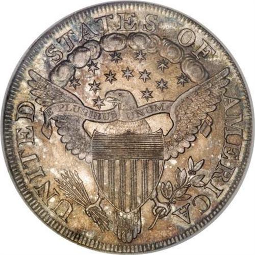 <B>1801 $1 MS62 NGC.</B></I> B-3, BB-213, R.3. Die State II, with the curved clash mark above and to the right of the M in UNUM and light clash mark from the O to cloud 6. Two obverse dies were paired with four reverse dies to produce four distinct varieties of dollars dated 1801. A comprehensive die progression study by Bowers and Borckardt (1993) reveals that three of the four 1801 variants were actually struck in 1802, although the other variety, BB-211, may have been struck after 1801 as well. To paint a simpler picture for collectors, Bowers states: "... 1801 B-213 has broken T letters on the reverse from the employment of a broken T punch. 1802 BB-241 has the same broken T on the obverse. As the 1802 obverse die could not have been made in 1801, nor would it have made sense to have made it in 1803, this isolates the year 1802 for the production of the reverse used to coin 1801 BB-213, another verification that 1801 BB-213 was struck in 1802 at the earliest." The practice of recording the number of coins struck during a specific year, regardless of the actual date on the dies used to produce the coins, was actually common during the early years of the first Mint. As such, official government mintages are of tangential value.<BR> Of course, when dealing with unusually high grade coins such as the current piece, the Condition Census is of greater interest to collectors. For that information we turn to numismatic researchers and early dollar specialists to help determine the conditional rank of certain specimens. Bowers lists the Condition Census for BB-213 as 60-58-58-58-55, although some suggest that grading standards have loosened since his 1993 opinion. What is clear to us, however, is that the current example is certainly anchored well within the roster of the finest known BB-213 dollars--an opinion that is bolstered by published population data. For example, as of (3/08) the highest grade awarded to this variety by NGC is a sole MS62--this piece--although we add the disclaimer that five others have been certified at the same level without distinction of the variety. Being that BB-213 is the third scarcest of the four 1801 dollar varieties, it is probable that the other MS62 coins represent the two more common die marriages.<BR> The new owner of this specimen will revel in its splendid eye appeal. Radiant luster serves to amplify the rich, variegated amber and gunmetal-gray coloration throughout. The details are well defined on both sides, with bold star details on the obverse and full feather definition on the eagle's breast. Truly a coin for the connoisseur.<BR><I>From The Queller Family Collection of Silver Dollars.</B></I><BR><BR><b>Shipping:</b> Coins & Currency (<a target="_blank" href="http://www.heritageauctions.com/common/shipping.php">view shipping information</a>)