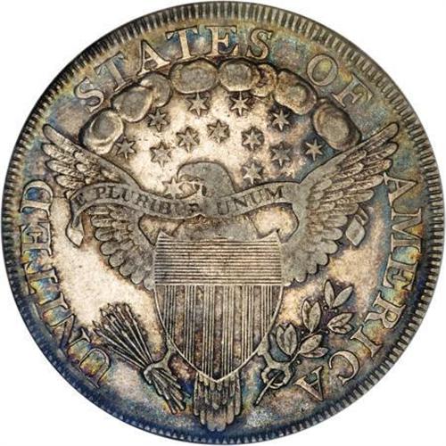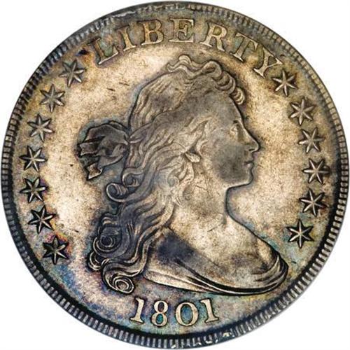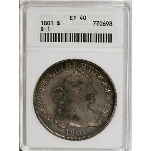 <B>1801 $1 XF40 ANACS.</B></I> B-1, BB-211, R.3. This partly lustrous Heraldic Eagle dollar provides aquamarine, golden-brown, and pearl-gray toning. All letters in E PLURIBUS UNUM are clear, as is the eagle's eye. Small marks on the obverse border at 5:30 and 11:30 merit only passing mention.<BR><BR><B>Coin Engraver:</B> Robert Scot<BR><BR><b>Shipping:</b> Coins & Currency (<a target="_blank" href="http://www.heritageauctions.com/common/shipping.php">view shipping information</a>)