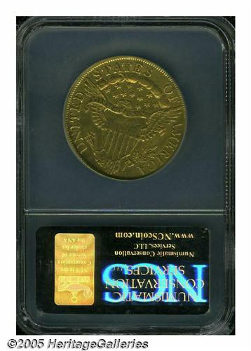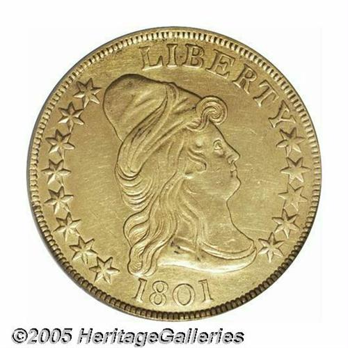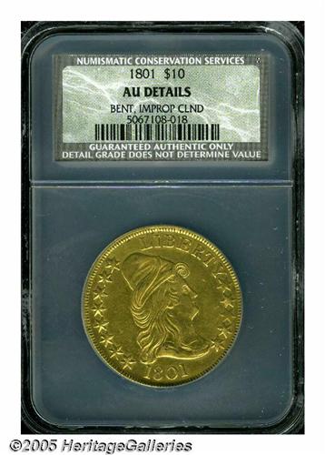 <B>1801<$10> AU Details, Bent, Improperly Cleaned, NCS.</B></I> Breen-6843, B. 2-B, Taraszka-25, R.3. The Wide Date 1801s are the most common variety among all 1795-1804 Eagles. The surfaces have a reflective nature due to the ill-advised cleaning. Described by NCS as Bent; however, this is not readily apparent inside the holder.