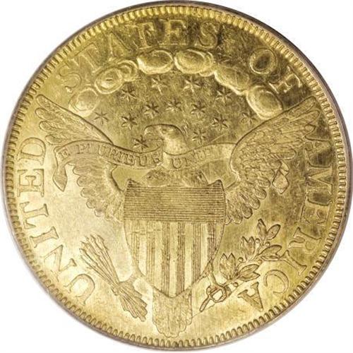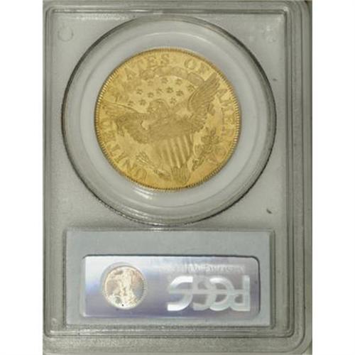 <B>1801 $10 AU53 PCGS.</B></I> Breen-6843, Taraszka-24, BD-1, R.5. Just two die marriages are known for the 1801 eagles, coined from two obverse and two reverse dies. Only about 40 to 50 examples of the BD-1 are known, while several hundred of the other die pair are known. The obverse of this early die state piece has no cracks or other apparent die defects, and the reverse has heavy die cracks on its reappearance after early states of 1800. The reverse die was reunited with the 1800 obverse after this 1801 die shattered. Both sides of this green-gold piece are abraded, but retain prooflike mirrors around the devices.<BR><BR><B>Coin Engraver:</B> Robert Scot<BR><BR><b>Shipping:</b> Coins & Currency (<a target="_blank" href="http://www.heritageauctions.com/common/shipping.php">view shipping information</a>\)